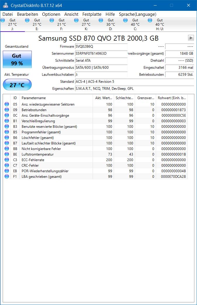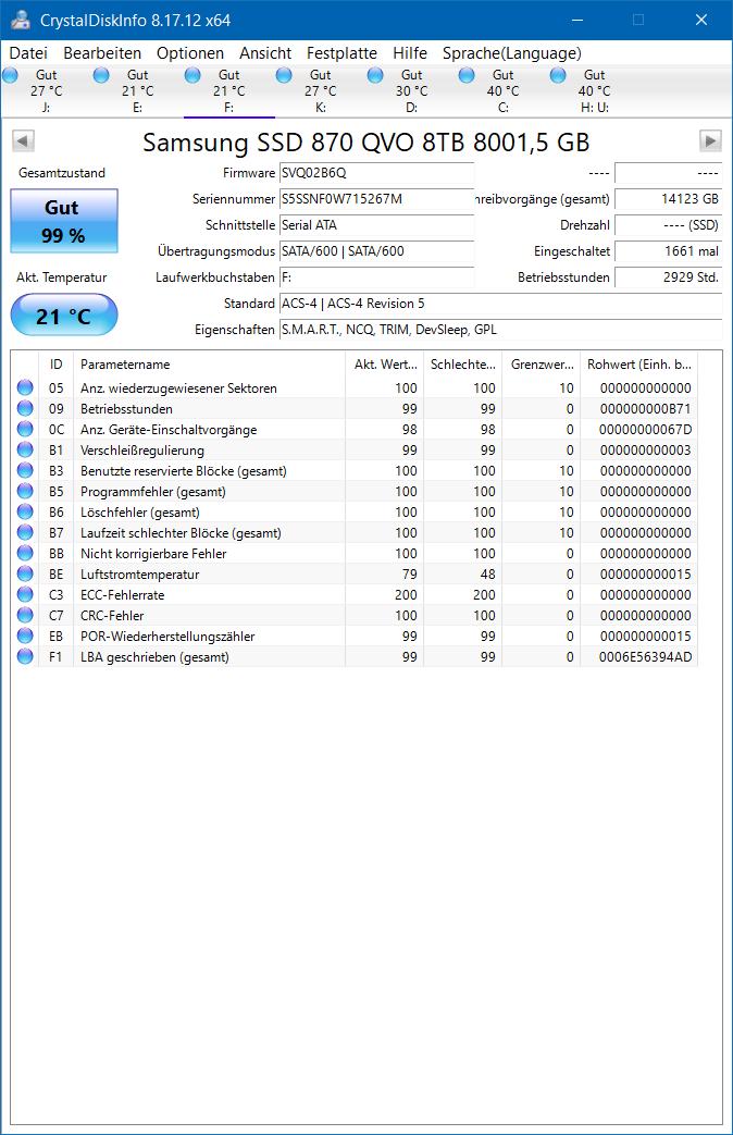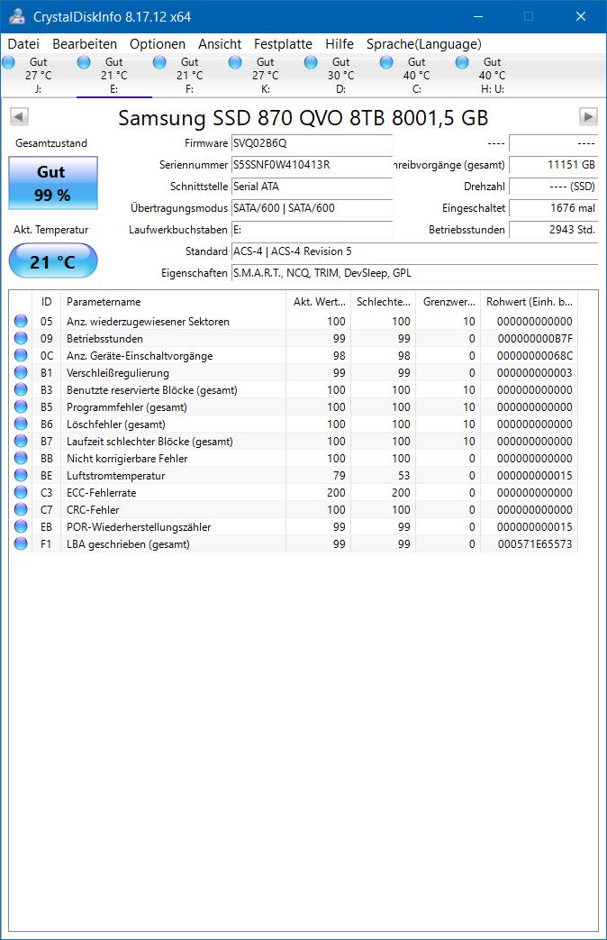 - + die betroffenen 4 SSDs (1x Samsung SSD 860 EVO 4TB + 1x Samsung SSD 850 PRO 1TB + 2x Samsung SSD 870 QVO 8TB)