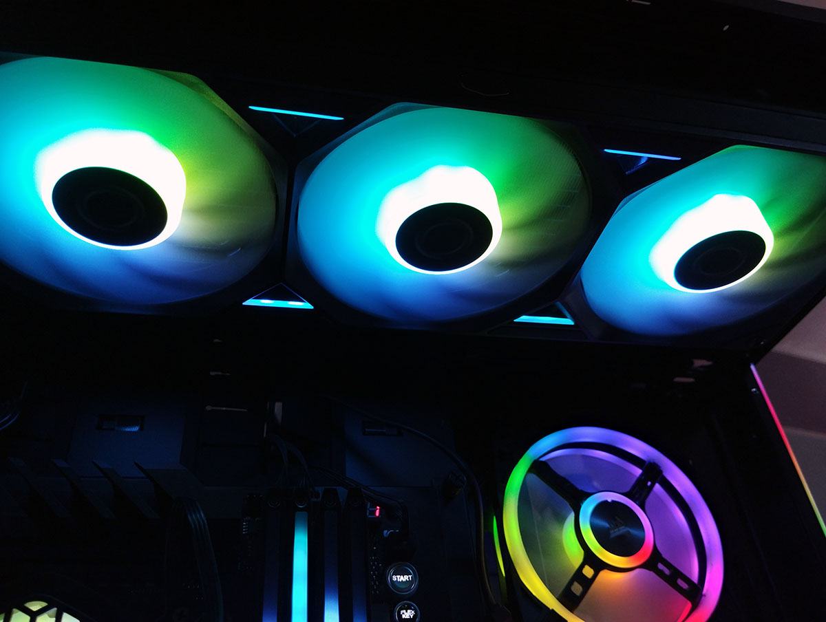 Die Beleuchtung ist kräftig, die Farben schön und klar. Ich hätte mir - passend zum vorinstallierten Pumpenaufsatz - gut einen Infinity-Effekt vorstellen können, was dem ganzen nochmal ein gewisses Etwas verleihen würde. Leider wurde darauf verzichtet, es handelt sich dennoch um schöne Lüfter mit einem guten Regelbereich.