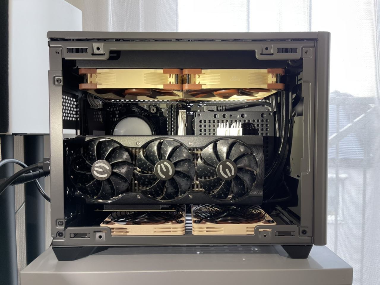 Hab auch einen kleinen Arbeitsrechner (primär für Videoschnitt) gebaut. Ist optisch nichts besonders, da er halb versteckt unter'm Tisch stehen/ hängen wird. Der 5900X wurde entsprechend der Kühlleistung eingestellt. Die Temps sehen soweit auch gut aus mit dem Fuma 2. Im CB R23 wird max. 62,5°C erreicht mit knapp 22K Punkten, wobei die Lüfter konstant unter 1.000 rpm bleiben. Schön leise und dennoch gut Power. Vielleicht drehe ich die CPU noch etwas weiter auf, da temperaturtechnisch noch genug Spielraum besteht.