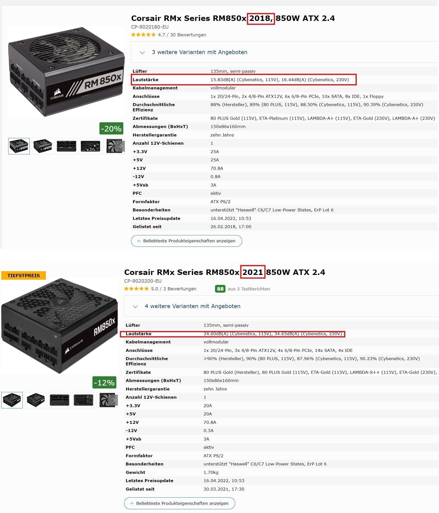 Die Laustärke ist dadurch höher wie man auch bei geizhals.de (Bild unten) sehen kann Corsair, RM850x Watt 16,44dB (2018 Modell) zu 34,65dB (2021 Modell) .