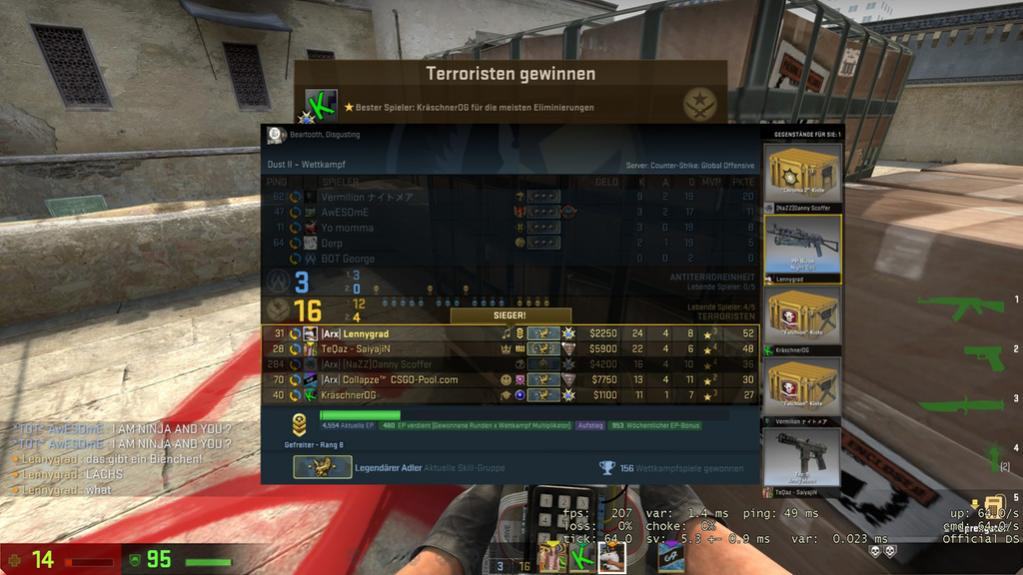 Und noch was zu meinem Screenshot, falls ich mich recht entsinne war die Person, die geleavt ist, auch die schlechteste K/D. Ich mein, das war derjenige, der einen Kill hatte und uns die ganze Zeit als Hacker bezeichnet hat, was auch nicht wirklich verwunderlich ist.