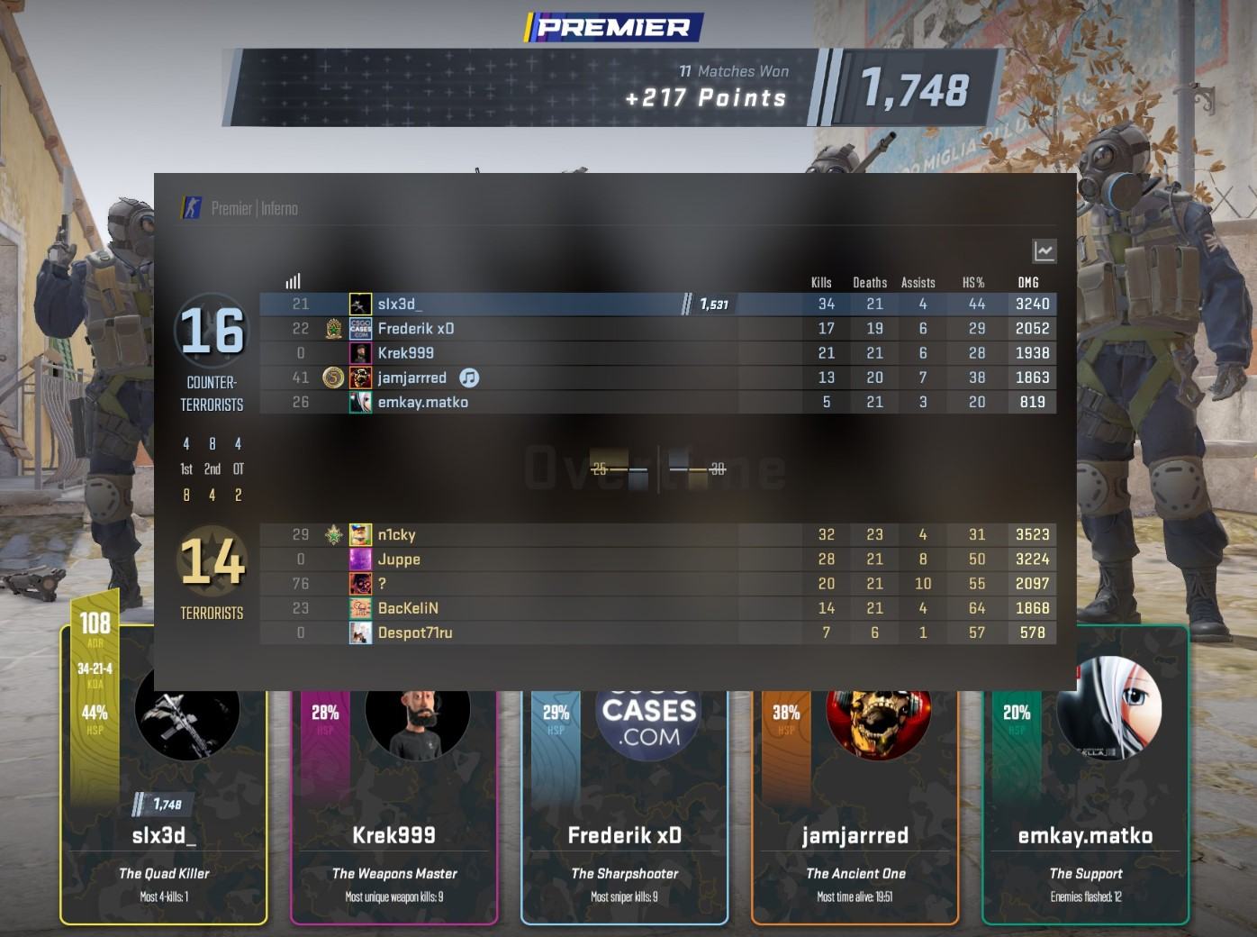 nur um nochmal zu verdeutlichen was CS2 für mich bedeutet: 4000 Spielstunden, 1,5k Elo laut Premier = das ist gar nix, quasi Anfängerlevel, kein Aim, keine Game Sense, kein Movement. Alles klar. Als Konsequenz bekomme ich ausschließlich solche Matches wie dieses gerade: 5 gegen 4, weil einer bei den Gegnern vorzeitig raus ist, keine Comms in meinem Team, dazu einen mit 5-21, der tatsächlich 1,5k Elo haben sollte. Und trotzdem gewinnen wir nur knapp in der OT, weil ich nicht auch noch trollen anfange und mir halbwegs Mühe gebe. Schmutz-Accounts im Gegnerteam sind ja Standard, nicht der Erwähnung wert.