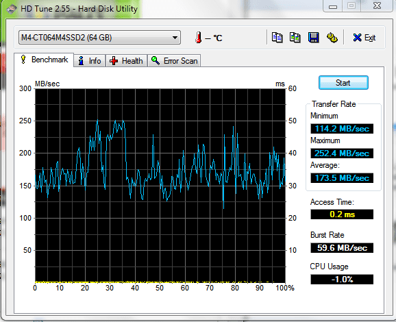 nachdem mir meine Crucial M4 64GB in meinem Thinkpad x201 (i5 2. Gen.) recht lahm vorkam, habe ich mal HD tune drübergejagt und ein Ergebnis bekommen, das mich etwas überrascht hat: