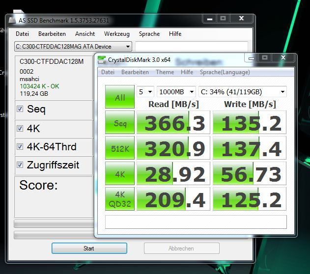 Da kann bei "SyPi" aber trotzdem was nicht stimmen, ich habe am ICH10R die Werte wie im Bild, vor allem die 4K Schreiben sind extrem low. Bie mir läuft die C300 im Übrigen immer am ICH10R, der SATA3-Controller ist mittlerweile abgeschaltet, zu grottig der Marvel-Chip - die Performanz am Intel ist wesentlich besser bei 4K - wird Zeit das Intel SATA3 bringt.