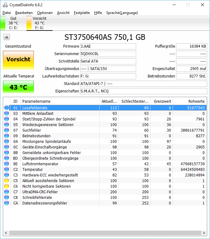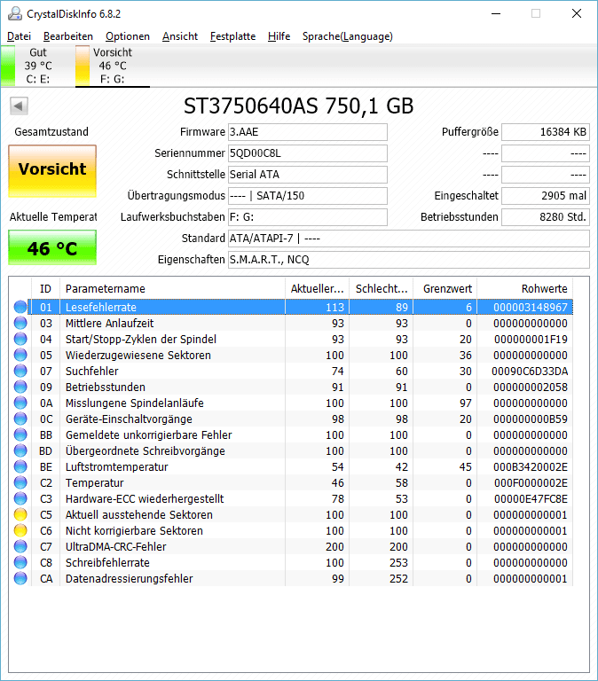 Bei den Attributen 01, 07 und C3 kann man nur bei der hexadezimalen Anzeige der Rohwerte erkennen, ob es wirklich Fehler gab, denn die Rohwerte zeigen dort in de beiden höchsten Byte (bei hexadezimaler Anzeigen die 4 Stellen links) die Anzahl der Fehler und in den anderen 4 Bytes (8 Stellen rechts) die Anzahl der Vorgänge, die dezimale Anzeige ist hier also unsinnig ich habe gerade auch kein Bock die Zahlen einzutippen und umzurechnen.