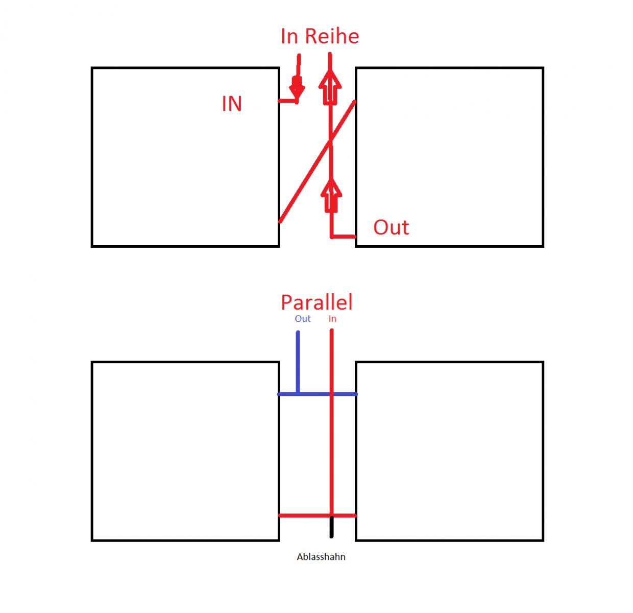 Wenn ich es noch richtig im Kopf habe, läuft das Wasser im Prinzip einmal im Kreis. Es sind ja immer 840er Radis die aufrecht stehen, dann wird immer ein Radi durchlaufen und dann geht es zum nächsten bis man wieder am Ausgang ist.