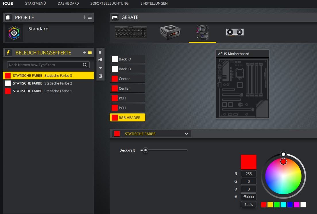 Vorher hat er die Einstellungen von Asus Aura genommen, Icue überschreibt dies nur und da das Plugin ARGB nicht überschreiben kann bleibt da die Asus Aura-Einstellung oder die Standardeinstellung. Allgemein finde ich die Software von Asus sowieso schrecklich. Diese Armoury Crate Kacke ist auch nicht besser in Sachen RGB-Steuerung als die veraltete, aber notwendige Asus Aura (1.07.79) Software.