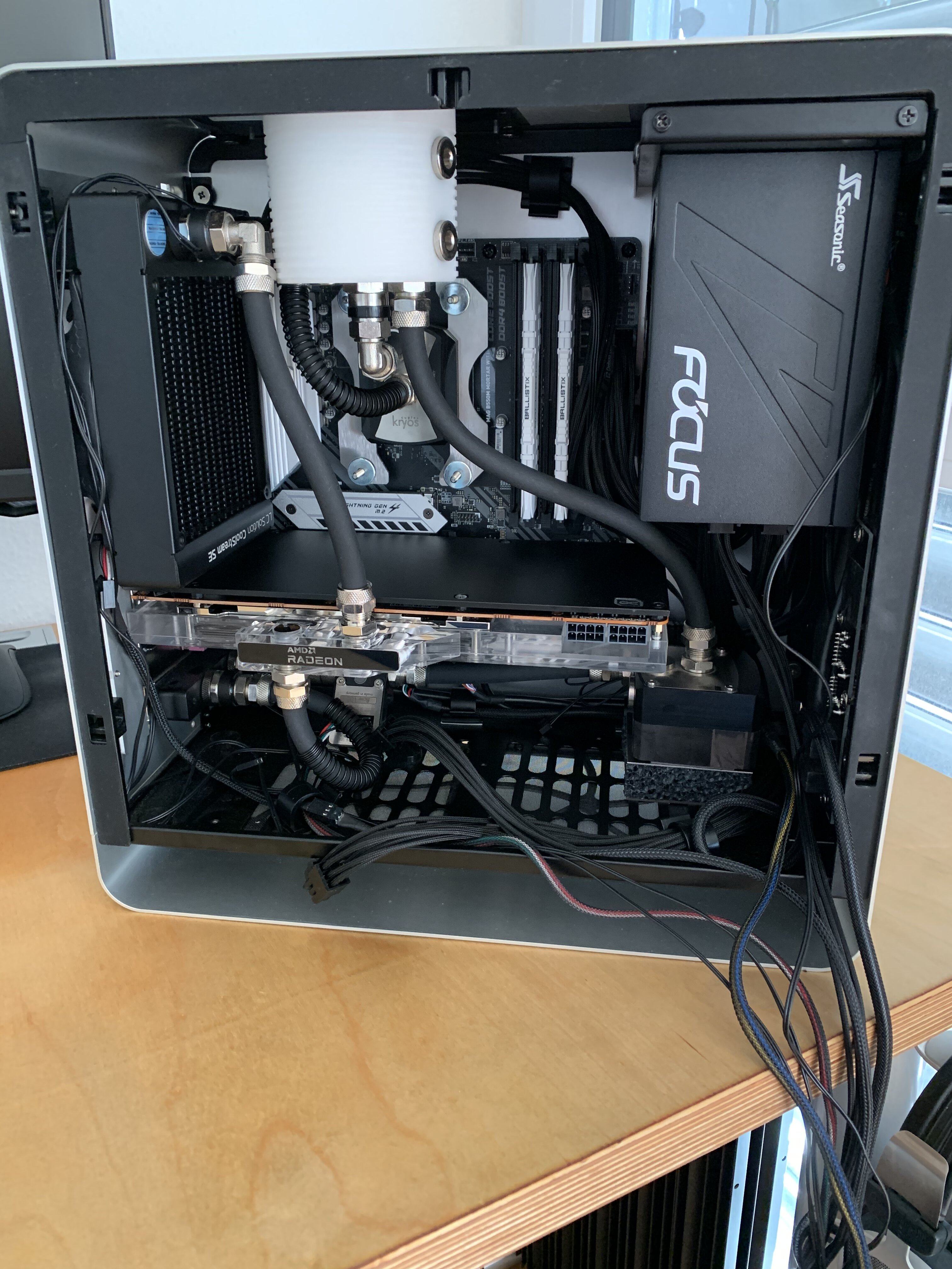 Diese Komponenten sind in einem ITX unter Luft bei Last nicht adequat zu kühlen, bei einem 280er Radiator mit 100% Lüfter und das ist dann immernoch bei 60 Grad+