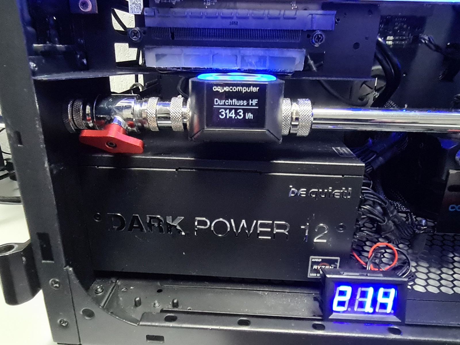 Also was ich aber feststelle ist, 3 Apex sind leicht übertrieben. Ich habe den Mora immer noch nicht mit eingesetzt, wie man an den Temperaturen sehen kann ist das auch nicht nötig. Also 2 420er Radis mit mäßiger RpM der Lüfter reichen locker. Was das für den Sommer bedeutet, werde ich hoffentlich erleben. Die Pumpen laufen mit der niedrigsten Last die möglich ist 1%, damit drehen sie um die 2200RpM und haben einen Durchfluss von 141l/h vom HFN ausgegeben. Ich weiß noch nicht wann, aber eine kommt raus oder wird nur abgeschaltet. Und was ich jetzt feststelle ist, die D5 Next ist ein Radaubruder, es ist viel ruhiger nachdem die letzte D5 Next raus ist. Also alles gut.