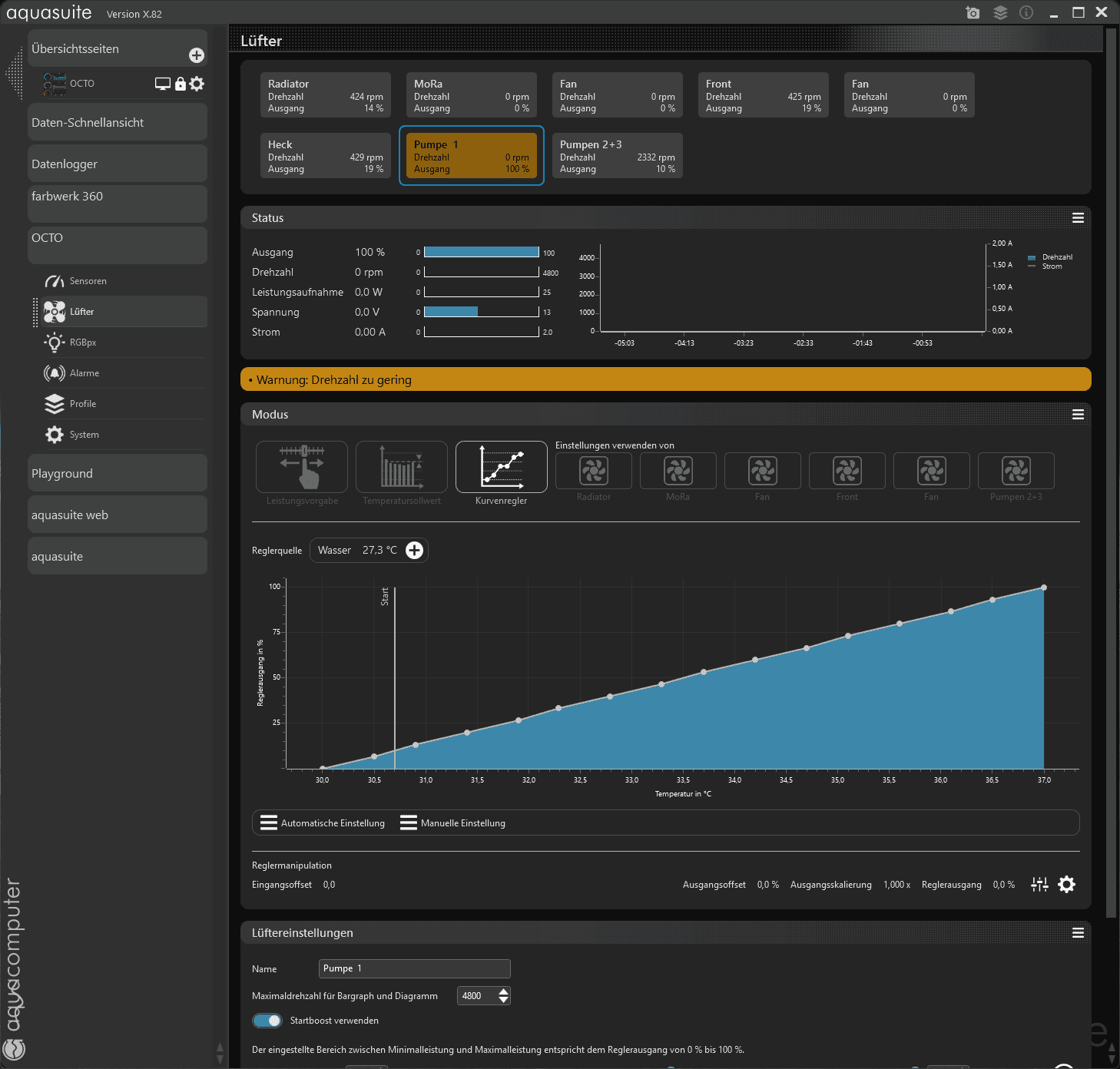 Stromanschluss ist wie vorher, PWM-Signal vom Octo sollte auch vorhanden sein, dessen Lüfteranschluss ist zumindest intakt, hab ich getestet. Die Aquasuite (Balken unter "Status") sagen "Ausgang 100 %", die Spannung oszilliert zwischen den beiden Punkten 0 und 12 V.