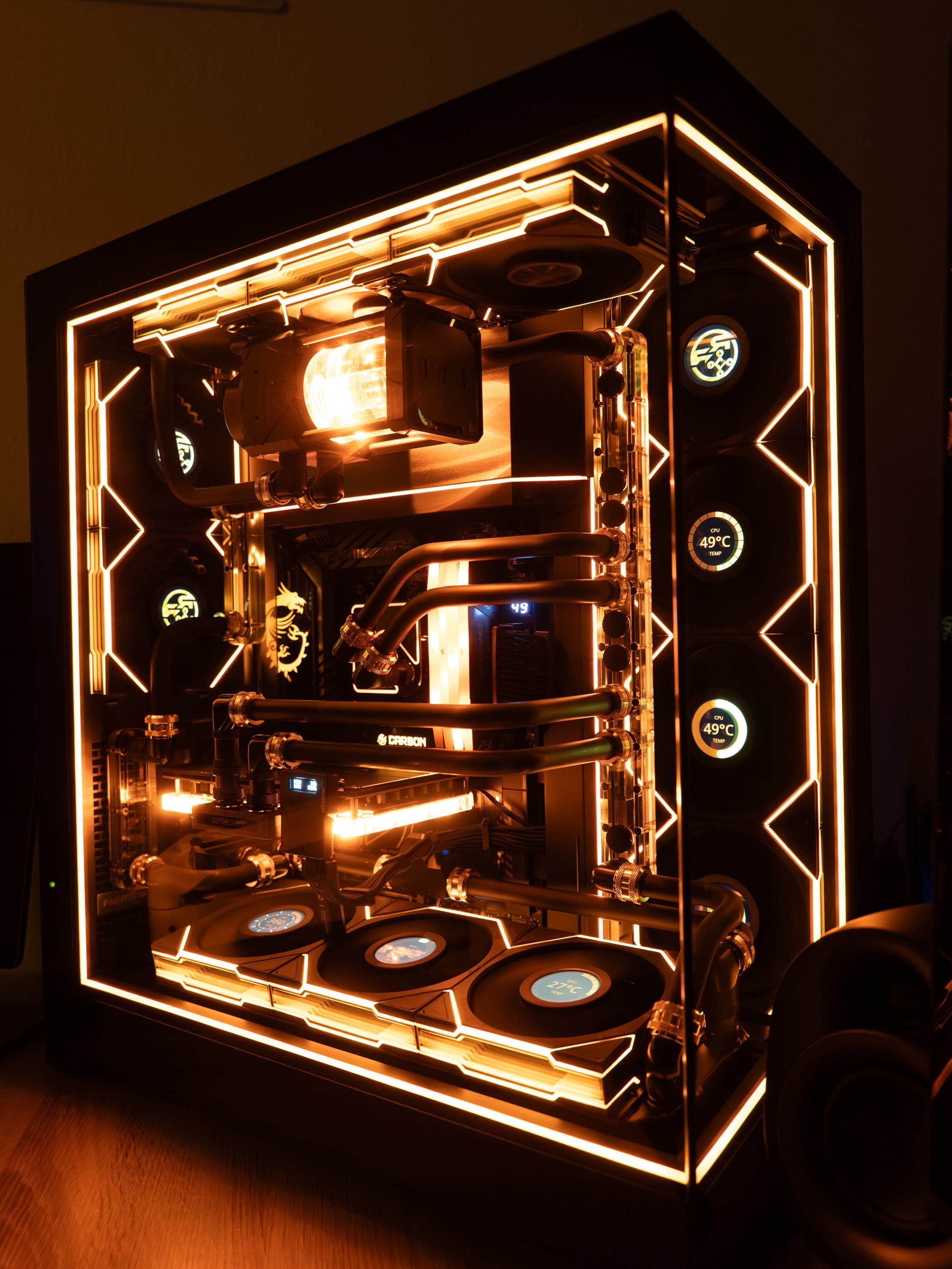 Verbaut sind 2x480er UT60 ausblasend, 5x140er Lüfter einblasend, CPU und Grafikkarte im Loop.