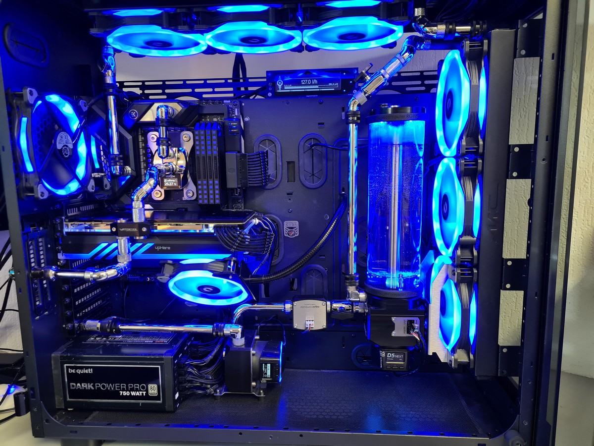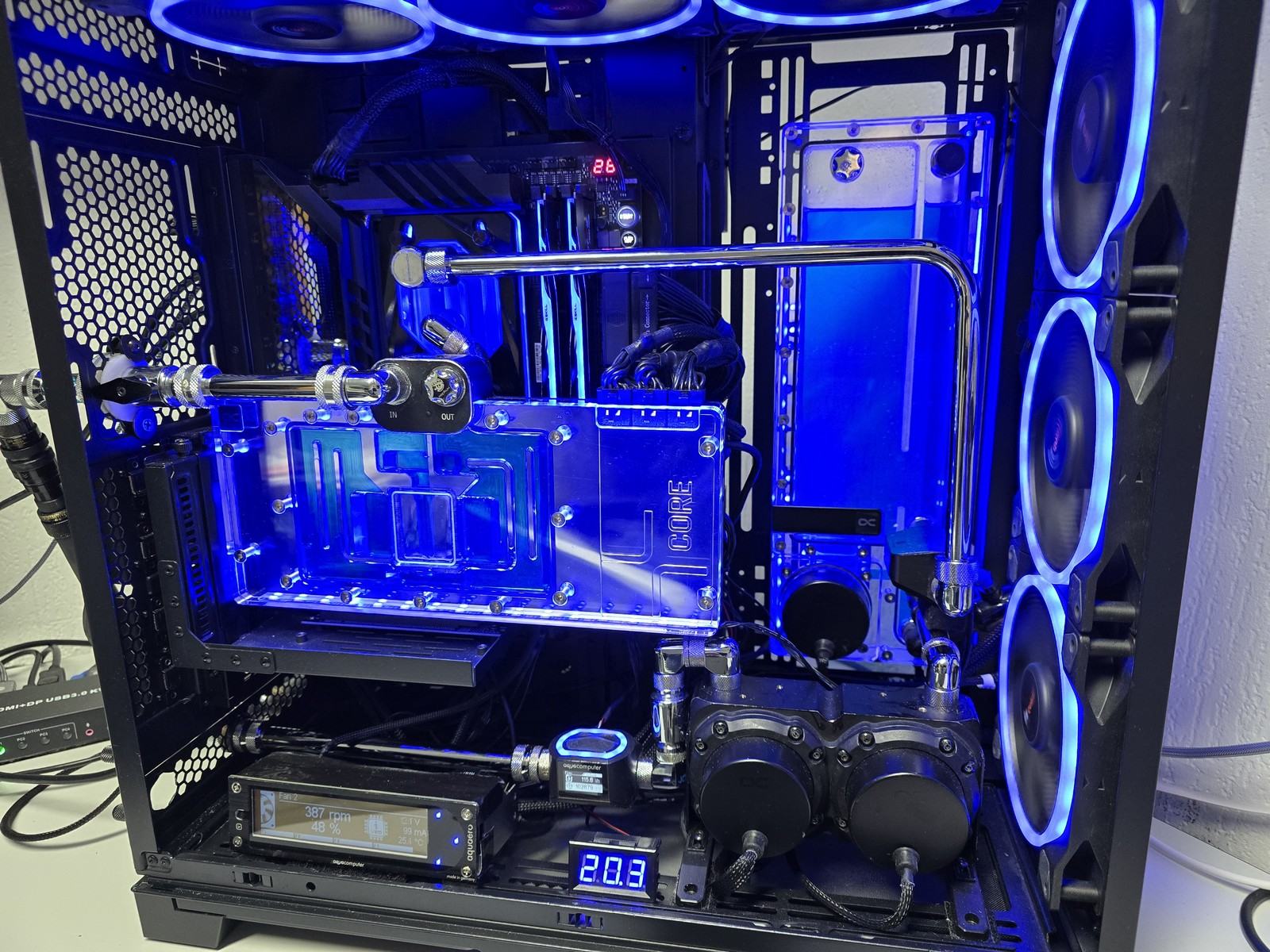 Flowrichtung: AGB (Aquacomputer Aqualis 850 ml)->Pumpe (Aquastream XT)->Boden-Radi (360x45, einblasend)->Frontradi (360x30, einblasend) -> Deckelradi (360x60, ausblasend) -> Heckradi (120x30, ausblasend)- > CPU-Kühler (Alphacool Core 1) -> GPU-Kühler (Alphacool Eisblock Aurora) -> AGB