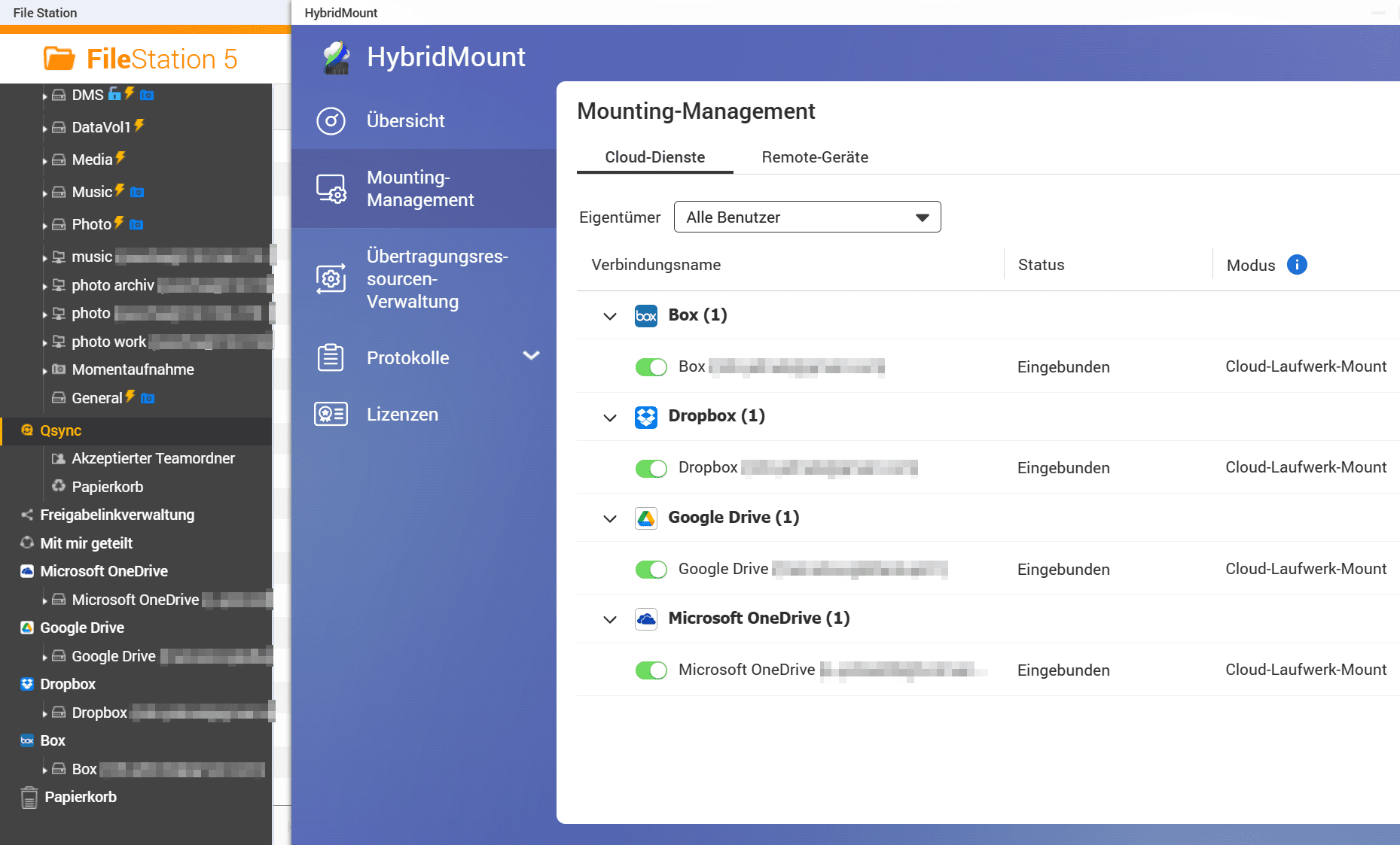 Mit der Software HybridMount kann man wie oben schon erwähnt sehr einfach verschiedene Speicheranbieter direkt in das QNAP einbinden. Dabei ist es egal ob es sich um einen CIFS-Mount, Google Drive, OneDrive oder weitere Anbieter handelt. Diese tauchen nach erfolgreicher Kopplung direkt in der File Station auf und lassen sich dort wie in lokales Laufwerk behandeln.