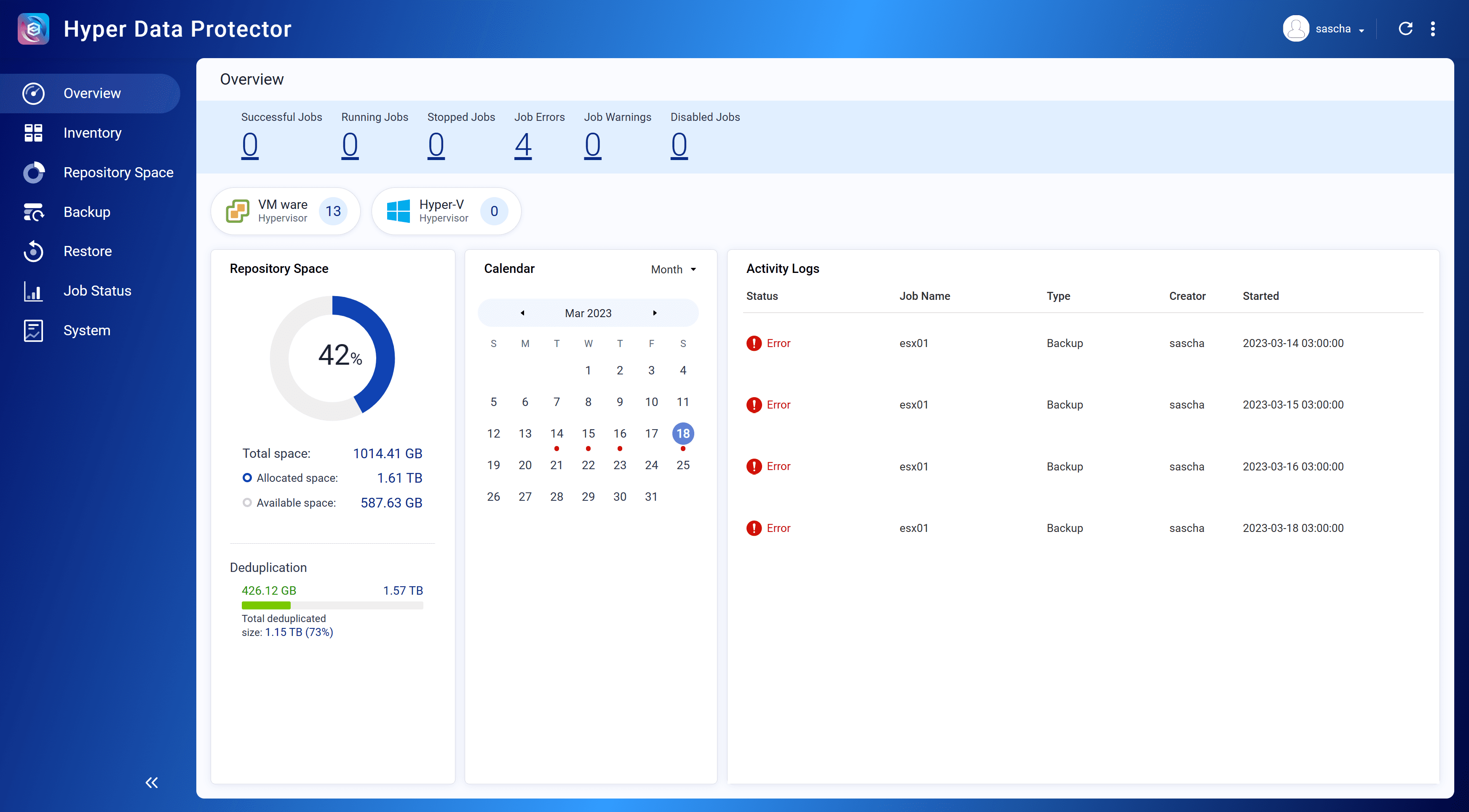 Mit dem Hyper Data Protector lassen sich ganz einfach VMware oder Hyper-V Umgebungen sichern und wiederherstellten. Das Ganze kommt ohne zusätzlich Lizenzgebühren und ist quasi vollständig mit dem Kauf des QNAP erledigt.Nach der Installation lässt sich die App einfach starten und öffnet sich in einem neuen Fenster. Hier wird man von einem übersichtlichen Dashboard begrüßt, das einem gleich anzeigt, dass ein Repository Speicherplatz angelegt werden muss. Hierzu muss lediglich ein Ordner auf einem bestehenden Volume ausgewählt werden. Ich empfehle hier allerdings ein Volume ohne Cache oder Encryption zu nutzen, da hier beim Backup zum einen eine eigene Verschlüsselung zum Tragen kommen kann und zum anderen sowohl Deduplizierung als auch Komprimierung gleichzeitig genutzt werden. Die dadurch entstehenden Schreibzyklen würden die SSD unnötig belasten.