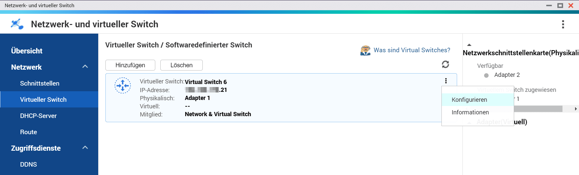 Ich habe mich dazu entschlossen dem NAS eine statische IP-Adresse außerhalb des DHCP-Bereiches meines Routers zu geben. Dazu startet man die App „Netzwerk- und virtueller Switch“ > Virtueller Switch und klickt dann in der Mitte auf das 3-Dot-Menü und wählt dort konfigurieren aus.