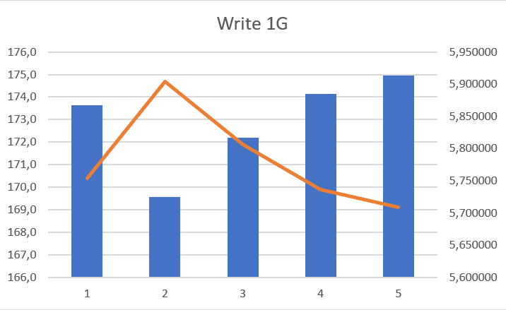 Alle Tests wurden im RAID1 und einer Blockgröße von 1K durchgeführt. Jeder Test wurde 5x durchgeführt mit einer Pause von 10 Sekunden zwischen jedem Test und habe den Mittelwert davon gebildet (Excel sei Dank 😊). Die Befehle dazu, falls es ebenfalls jemand testen möchte, waren die folgenden: