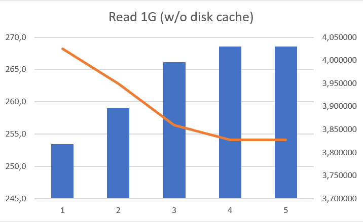 | 5 | None | Cache+Enc | 10 G | to cache: 166 MB/s from cache: 139,7 MB/s | to cache: 385 / 875 from cache: 558 / 279 | ~ 11% | ~ 75% |