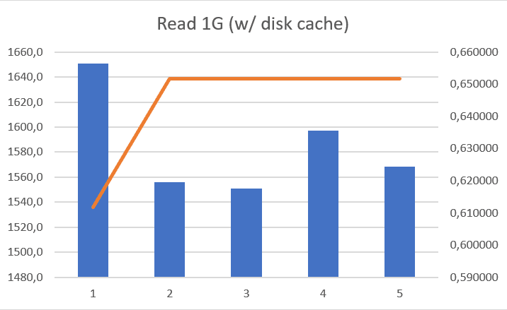 | Cache | Urandom | 1 G | 28,40 s | 36,1 MB/s | 0,80 s | 1,25 GB/s | 0,65 s | 1,55 GB/s |