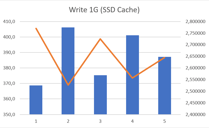 Etwas enttäuscht hat mich die Schreibe-Performance, diese war ohne SSD-Cache besser als mit. Wie schon weiter oben erwähnt liegt das vielleicht an meinen günstigen SSDs, aber ich wollte hier nicht noch mehr ausgeben für einen Test dessen Ergebnis ich beim Kauf noch nicht kannte.