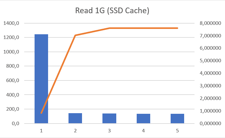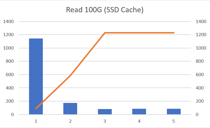Beim Lesenden Zugriff merkt man dann aber die Stärken des SSD-Cache. In den Diagrammen sieht man schon, wie der erste Zugriff noch recht langsam ist, alle folgenden Zugriffe dann aber extrem Flott von statten gehen. Gerade bei den Zugriffen auf das 100G File merkt man wie die Geschwindigkeit mit jedem Zugriff zunimmt. Der Erste Lesezugriff dauert noch knapp 20 Minuten bei ca. 90 MB/s, der Zweite Zugriff dauert noch nur noch etwas über 2 Minuten mit fast 600 MB/s und restlichen Zugriffe sind in jeweils 84 Sekunden erledigt bei 1,2 GB/s.