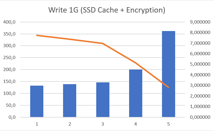 | 6 | Cache+Enc | None | 10 G | 1. 67,7 MB/s 2. 135,8 MB/s | 1. 329 / 239 2. 612 (SSD) / 493 (HDD) | 1. ~ 10% 2. ~ 15% | 1. ~ 75% 2. ~ 55% |