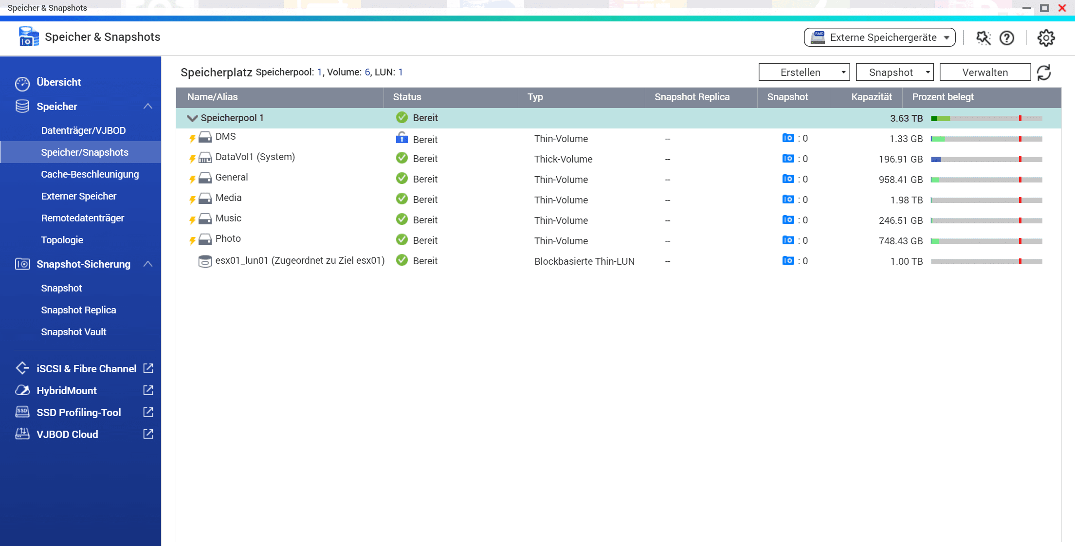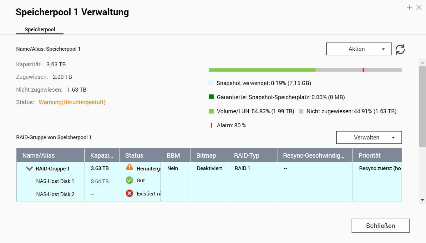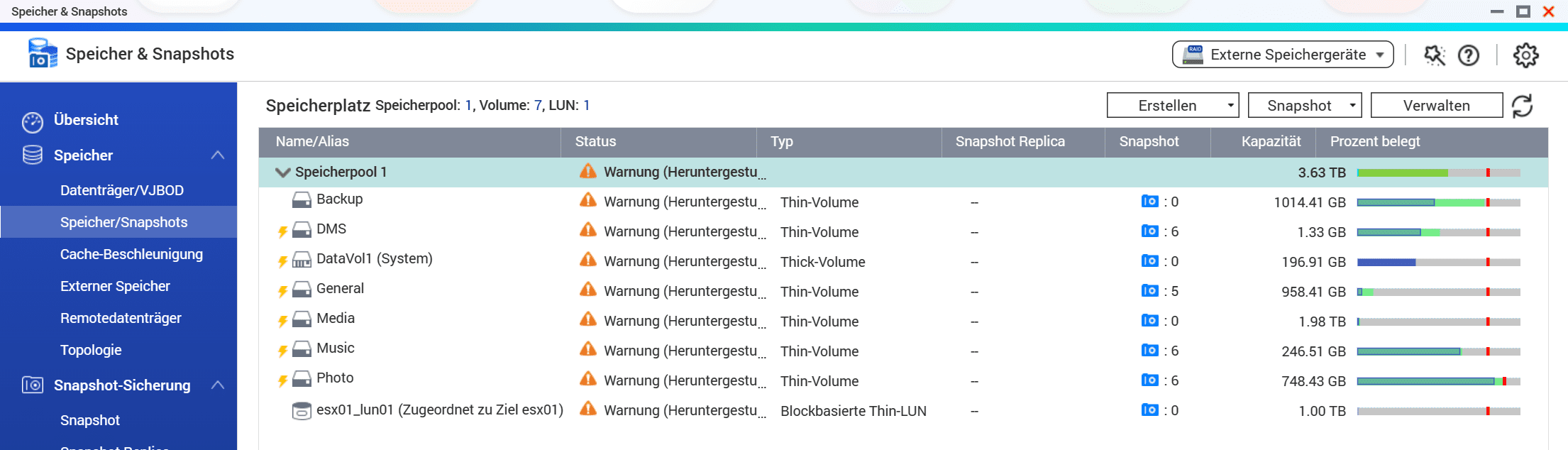 Dasa hat aber auch einen Nebeneffekt: Man sollte die Speicherauslastung immer im Blick behalten. Durch das sogenannte Thin Provisioning ist es möglich, Volumes mit mehr Speicherplatz anzulegen als das NAS physikalisch zur Verfügung hat. In der hier getesteten Konfiguration sind zwei 4 TB Festplatten verbaut, mit einem RAID1 habe ich ca. 3,83TB zur Verfügung. Nun kann ich allerdings problemlos 8 Volumes mit je 1TB anlegen. Gelange ich aber an den Punkt, dass der Speicher voll ist, kann ich auf den anderen Volumes keine Daten mehr ablegen, obwohl mir noch freier Speicher angezeigt wird.