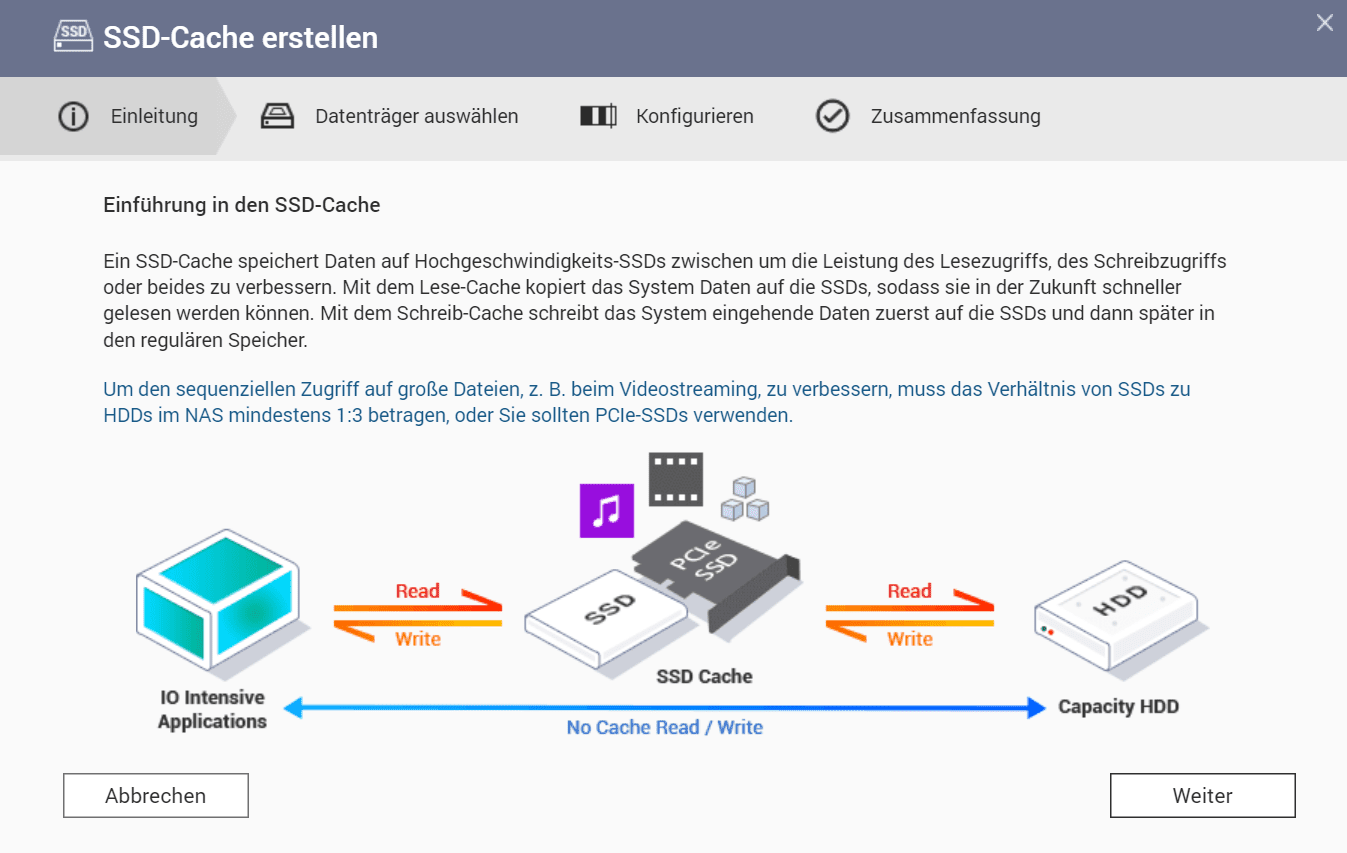 Der Wizard empfiehlt zwar eine Verteilung von 1:3 (also pro 100GB HDD sollten 33GB SSD-Cache verfügbar sein), das halte ich allerdings für etwas übertrieben.