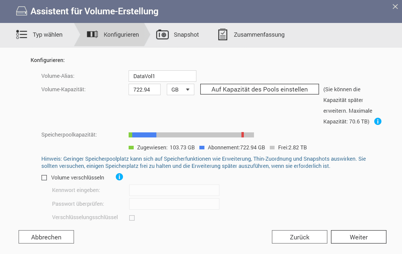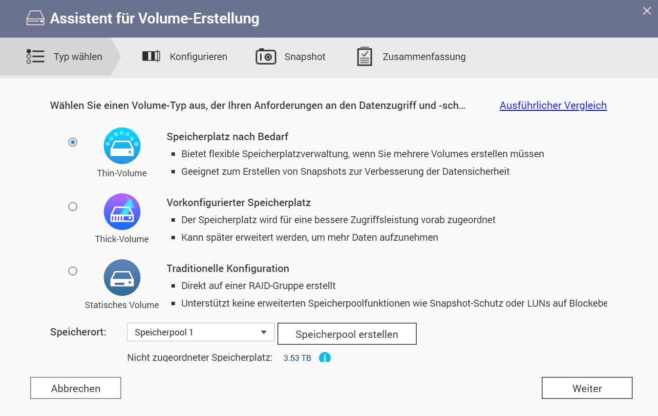 Nach der Erstellung des Storage-Pools wird man wiederum mit einem Wizard durch die Erstellung des ersten Volumes geführt. Bei einem Volume kann man auswählen zwischen folgenden Einstellungen: