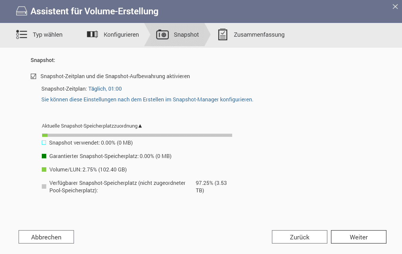 Der letzte Schritt besteht nun darin die Snapshots zu aktivieren oder auch nicht. Damit wird in regelmäßigen Abständen ein Snapshot des Volumes erstellt. Dieser sorgt dafür, dass die Daten festgehalten werden und man jederzeit auf diesen Snapshot zurückspringen kann oder Daten aus diesem Wiederherstellen kann, sofern man versehentlich etwas gelöscht hat. Das ist super, wenn man eine große Bildergalerie hat und ggfs. ein wichtiges Bild gelöscht hat. Diese Snapshots lassen sich schnell anlegen, so dauert die Erstellung meistens nur wenige Sekunden. Dennoch sollte man zusätzlich ein Backup der Daten erstellen, denn die Snapshots liegen auf denselben Datenträgern. Sollte diesen etwas passieren wären die Daten trotzdem verloren. Zu den Backups aber später mehr.