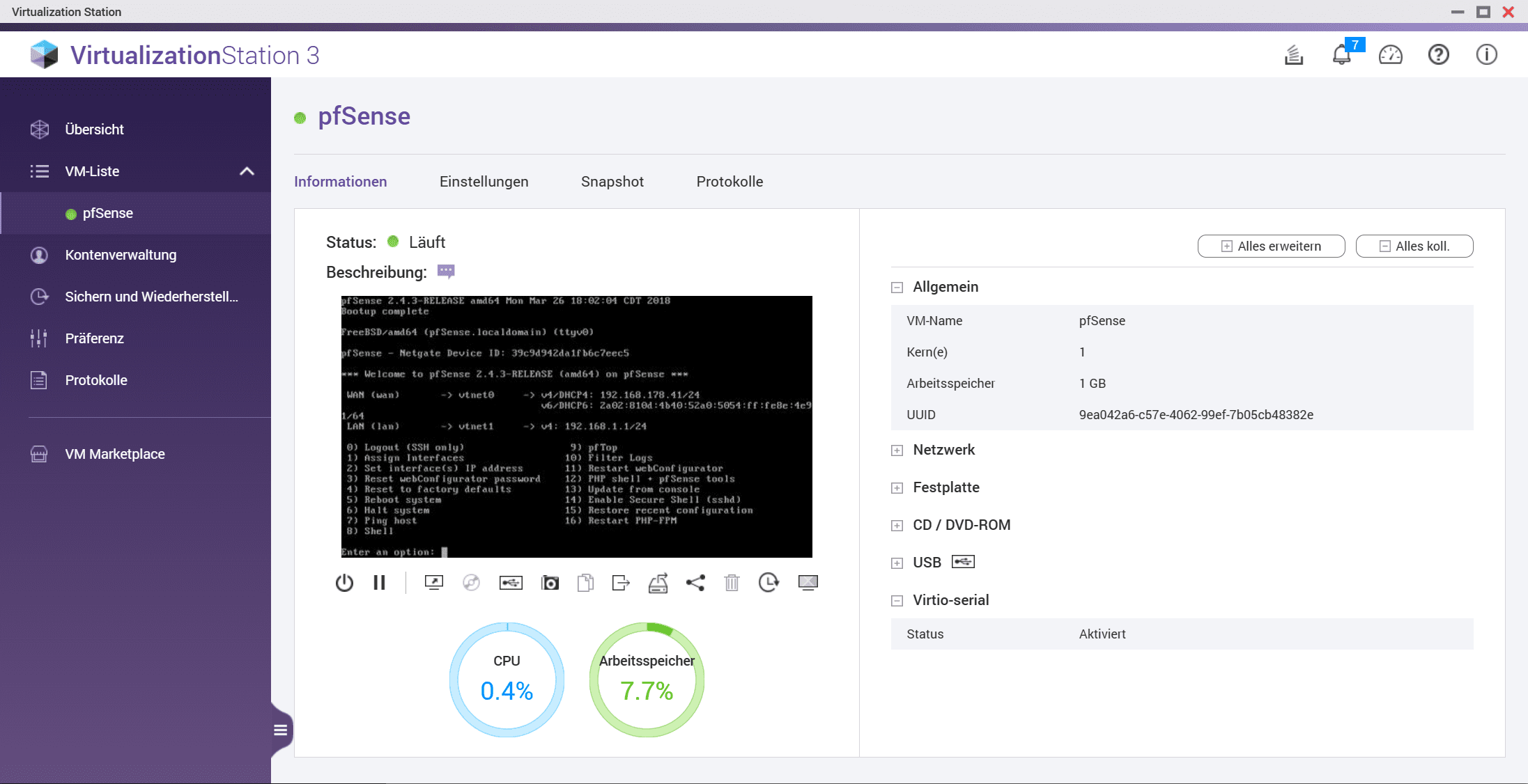 Hierbei handelt es sich um einen vollwertigen Hypervisor, ähnlich wie ESXi oder HyperV. Auch hier gibt es einen Marketplace, der einige fertig VMs bereithält. Hier werde ich mich für meinen Test an der VM „pfSense“ entlanghangeln. Windows auf dem TS262-4G zu installieren halte ich nicht für machbar, da ich nur 4 GB RAM zur Verfügung habe, den Versuch habe ich dennoch gewagt.Hier dauert die Erstellung einer Maschine deutlich länger als bei den Containern, dies liegt aber in der Natur der Sache selbst. Ein komplettes Betriebssystem benötigt deutlich mehr Ressourcen, dafür ist es aber auch komplett losgelöst vom darunter liegenden Betriebssystem.
