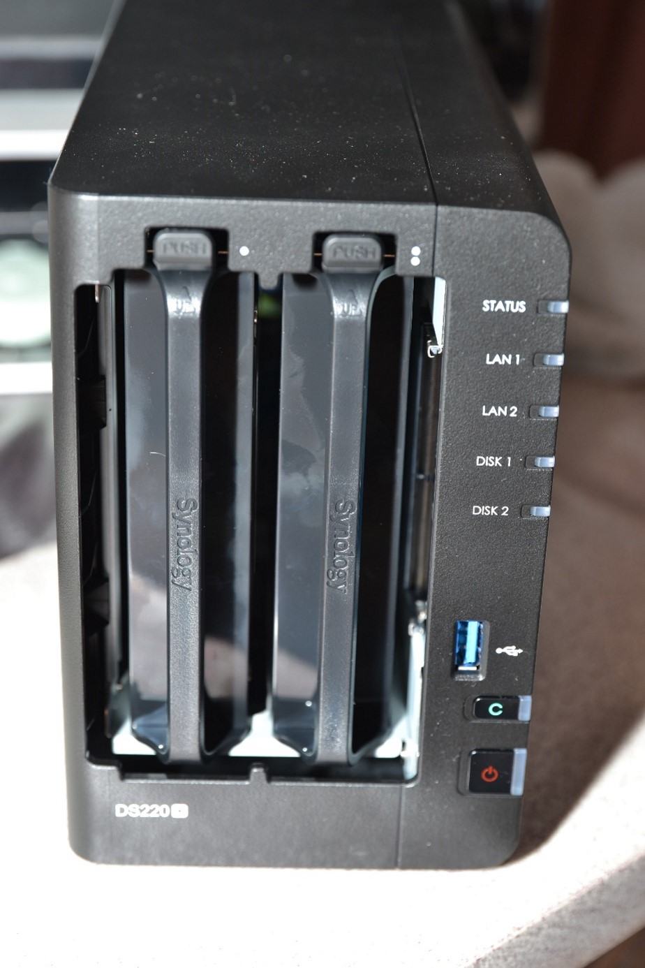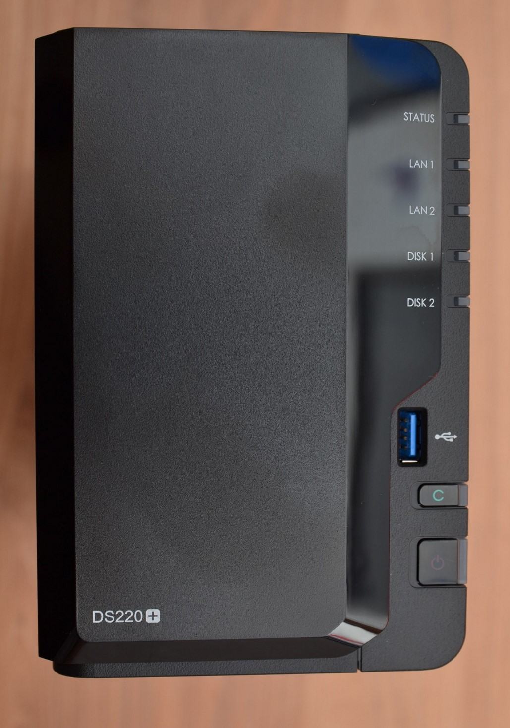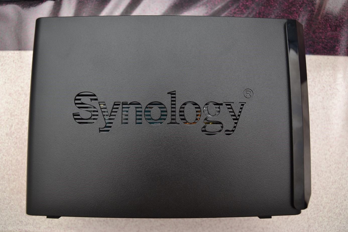 Das DS220+ kommt im bekannten Synology Look daher. Auf den Seiten findet sich jeweils das perforierte Synology Logo, dass auf einer Seite sogar einen kleinen Einblick auf die Platine ermöglicht.