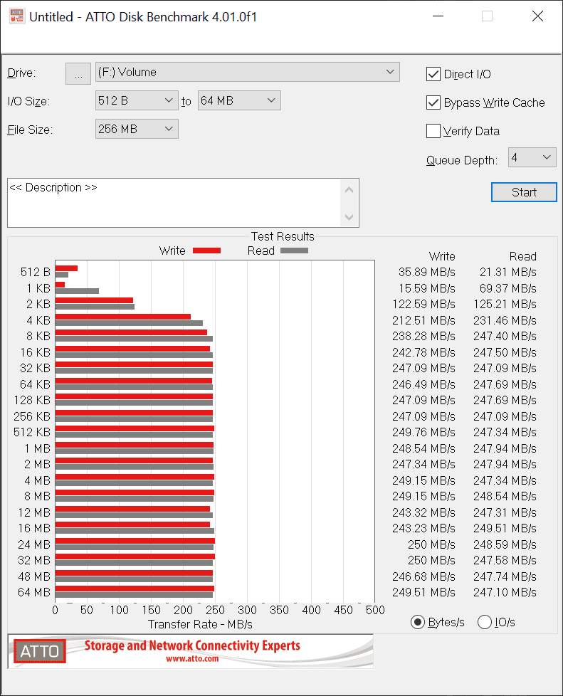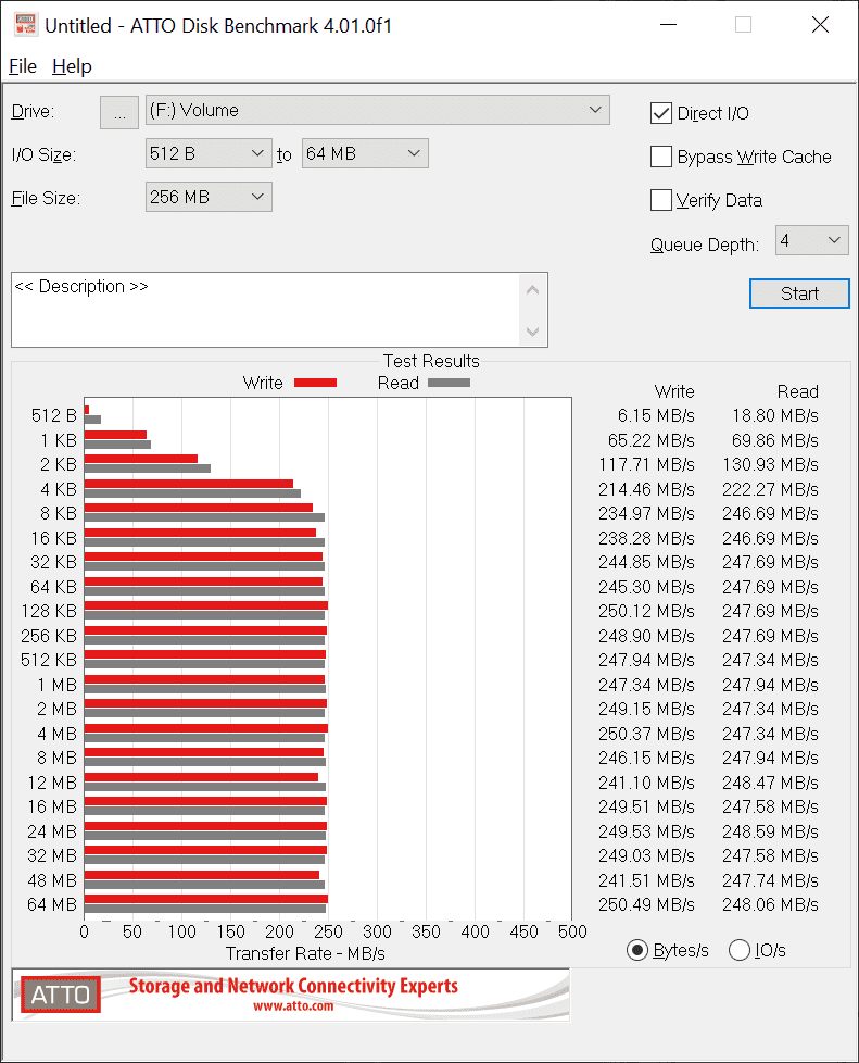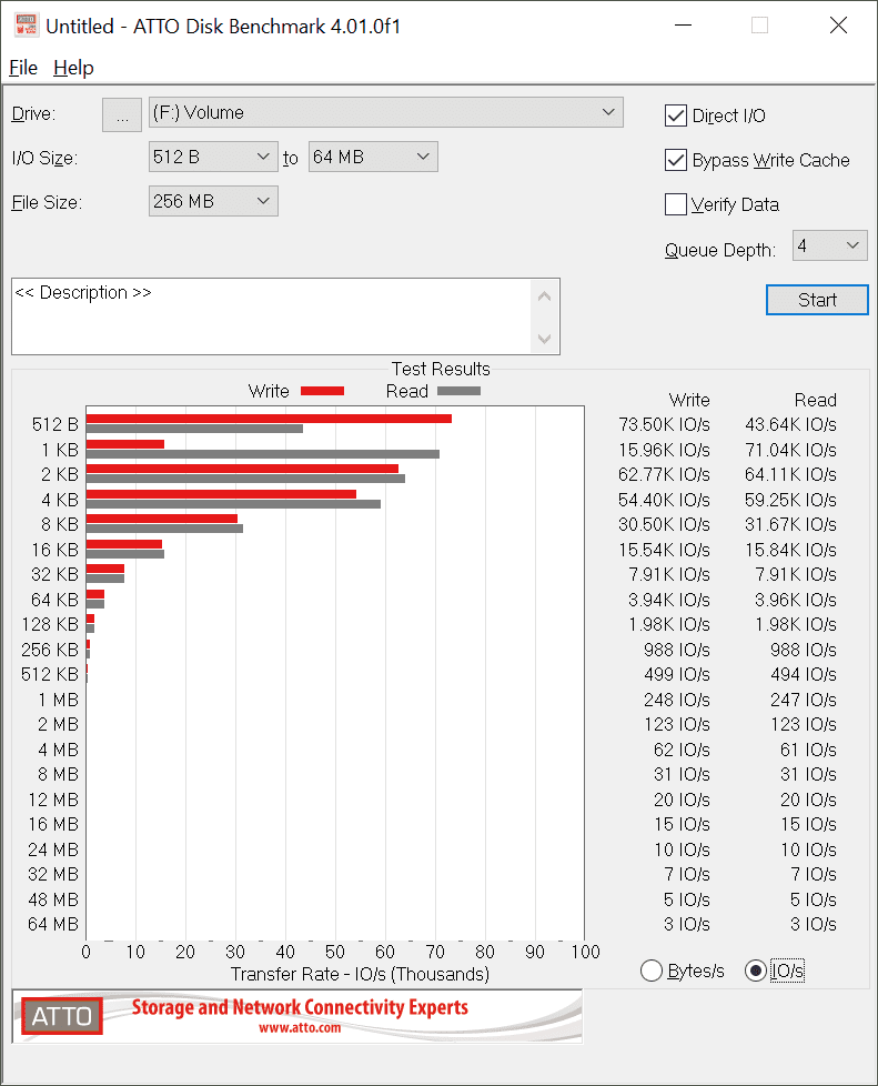 Atto ist ebenfalls ein synthetischer Festplattentest, bei dem aber die Möglichkeit besteht, den Festplattencache zu umgehen und so die rohe Schreibleistung der Festplatte selbst zu erhalten. Der Test ohne Cache unterscheidet sich allerdings nur minimal von dem Test mit Cache und bringt nur bei sehr kleinen Dateien einen Vorteil. Außerdem wird mit dem Tool noch die IO getestet und ausgegeben.Hier die Ergebnisse.