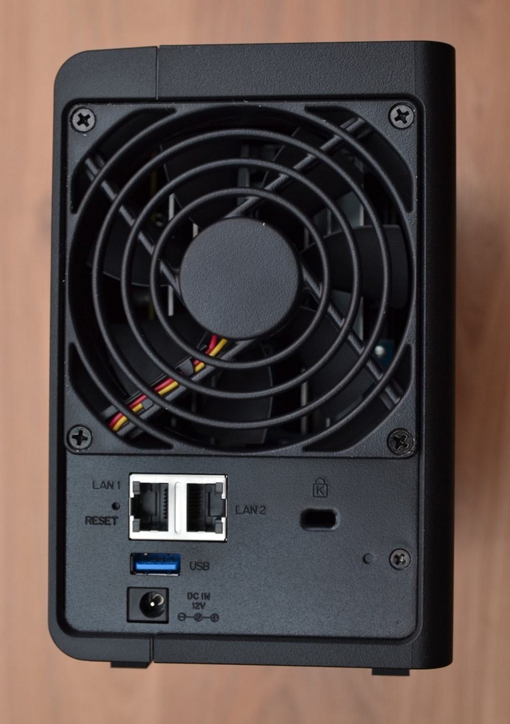 Auf der Rückseite befinden sich 2 Gigabit-LAN Ports, die mit dem DSM, Synology's NAS-Betriebssystem "Disk Station Manager", zu einem Bond zusammengefasst werden können. Hierzu später im Review mehr. Außerdem befindet sich hier der Netzteilanschluss, ein weiterer USB 3 Port sowie ein Kensington-Lock.