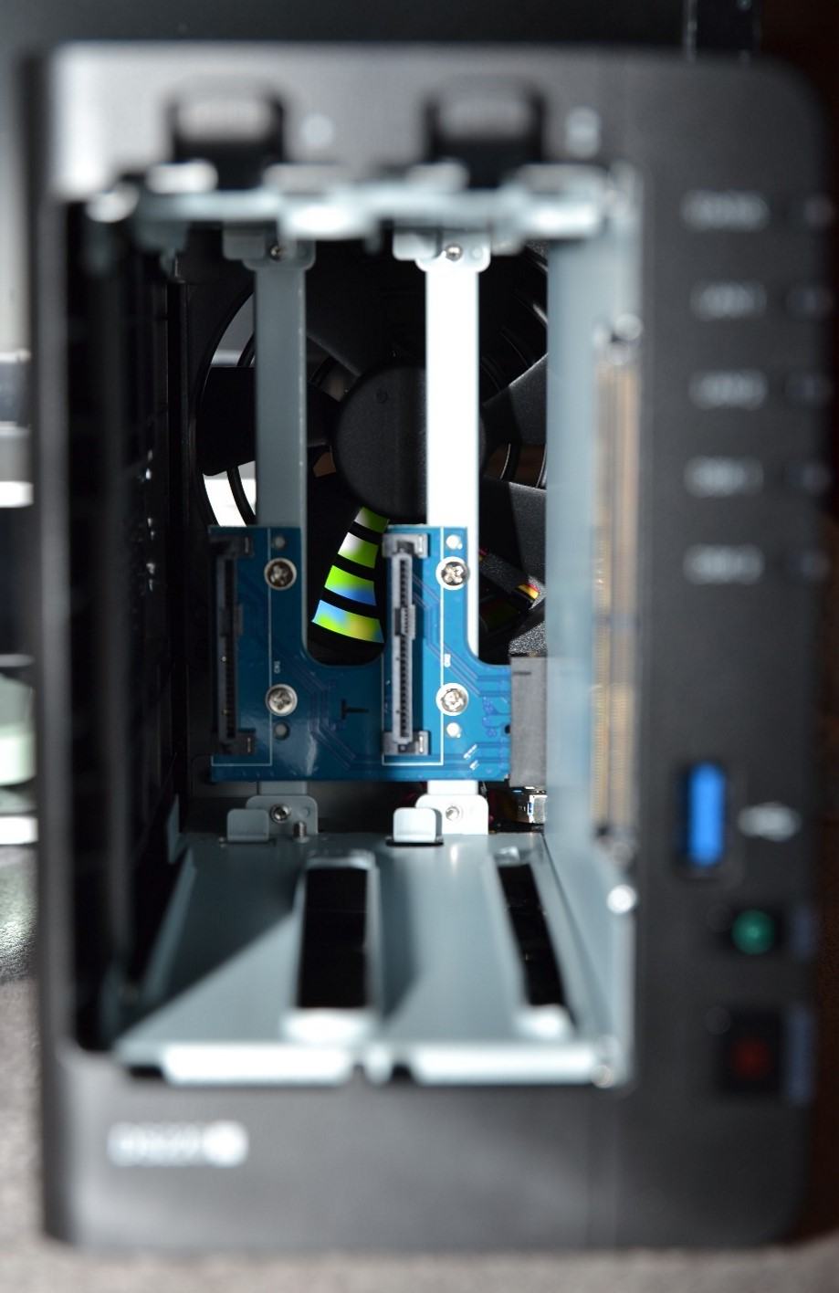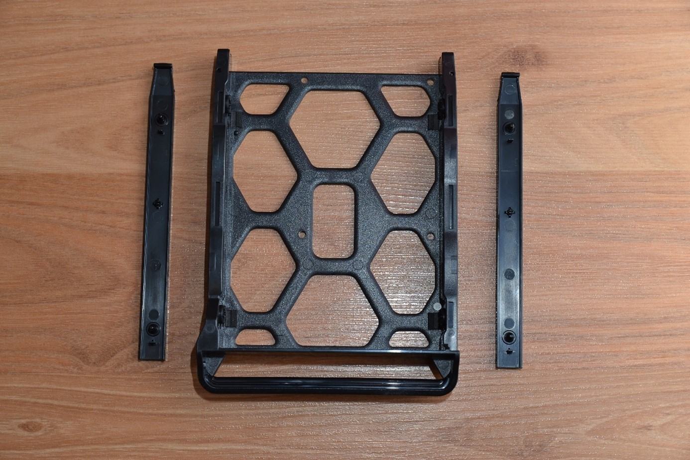 Innen befinden sich 2 Festplattenkäfige, die sowohl für 3,5’‘ als auch 2,5‘‘ SATA-Festplatten genutzt werden können. Für 2,5‘‘ Festplatten liegen dem Paket noch 8 kleine Schrauben bei, um diese zu befestigen. 3,5‘‘ Festplatten lassen sich mittels eines einfachen Klick-Mechanismus einsetzen. Dazu werden die Festplatten in die Festplattenkäfige eingelegt und dann einfach mit den Klemmen befestigt. Mit einem Blick nach innen bei entfernten Festplattenkäfigen sieht man die SATA Anschlüsse für die 2 möglichen Festplatten. Diese sind nach rechts mit dem Mainboard verbunden.