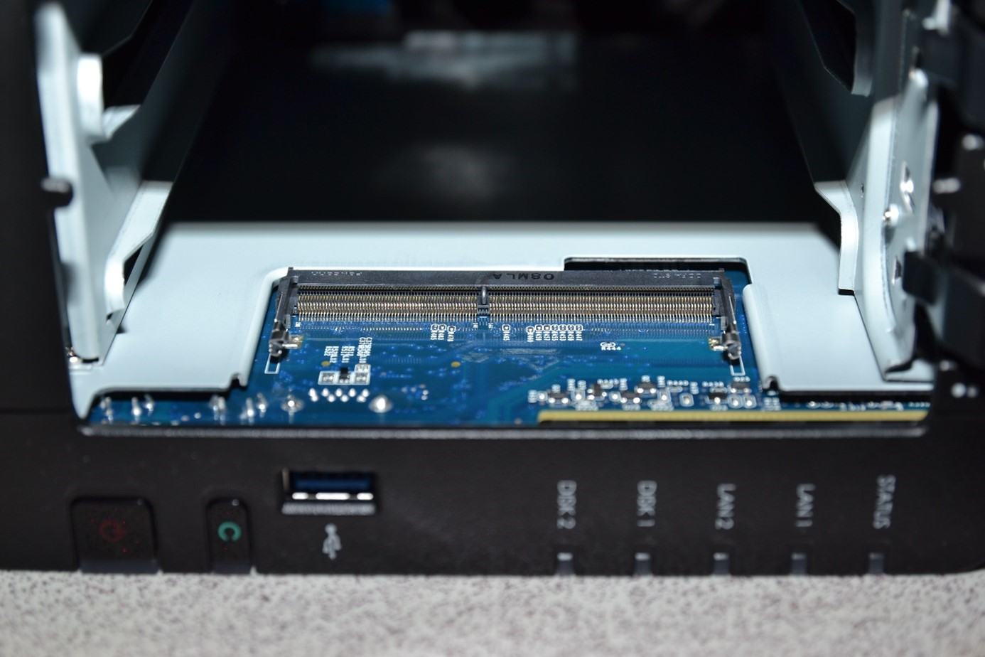 Innen befindet sich auch der Erweiterungsslot für den Arbeitsspeicher. Hier können zusätzlich 4 GB DDR4 RAM im SODIMM Format eingesetzt werden. Das NAS kann somit bis zu 6 GB Arbeitsspeicher ansprechen. Das ist beispielweise dann hilfreich, wenn man auf dem NAS virtuelle Maschinen betreiben möchte.