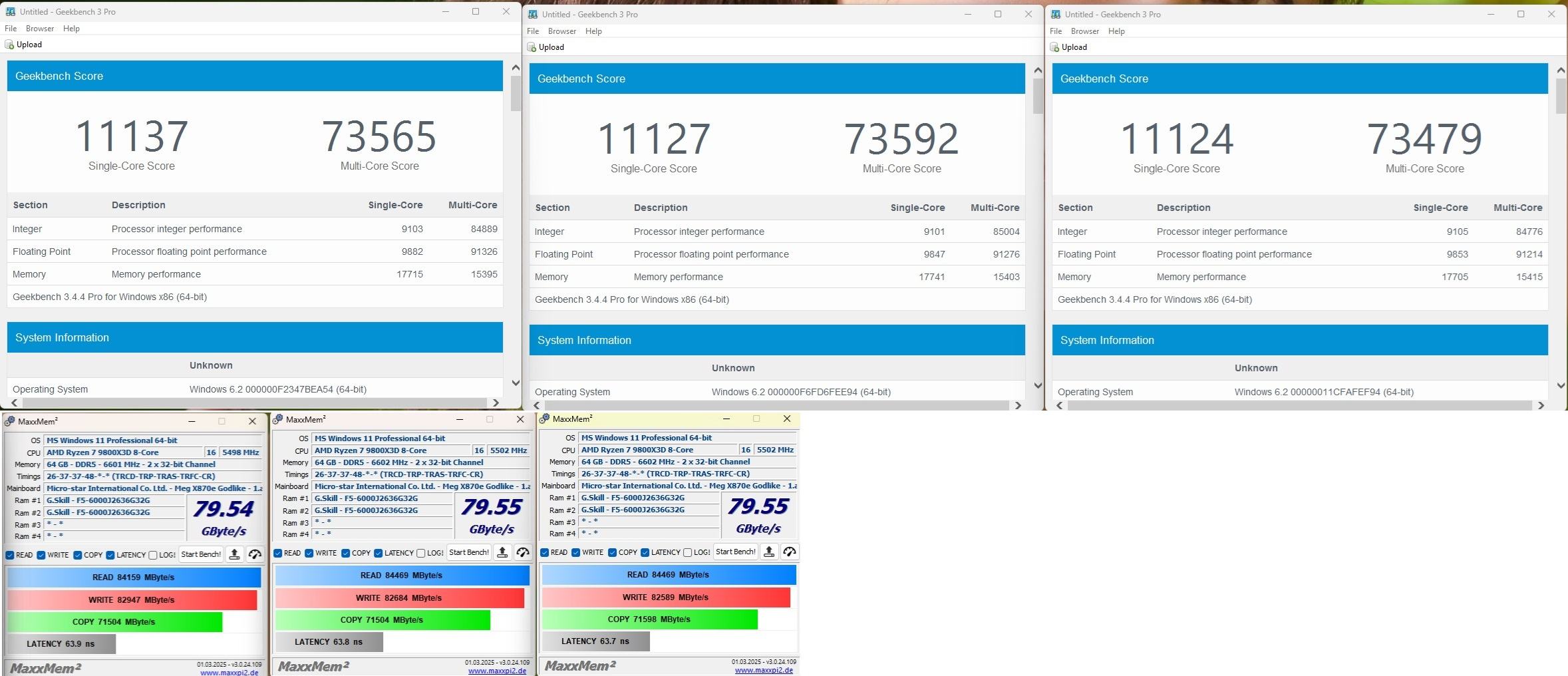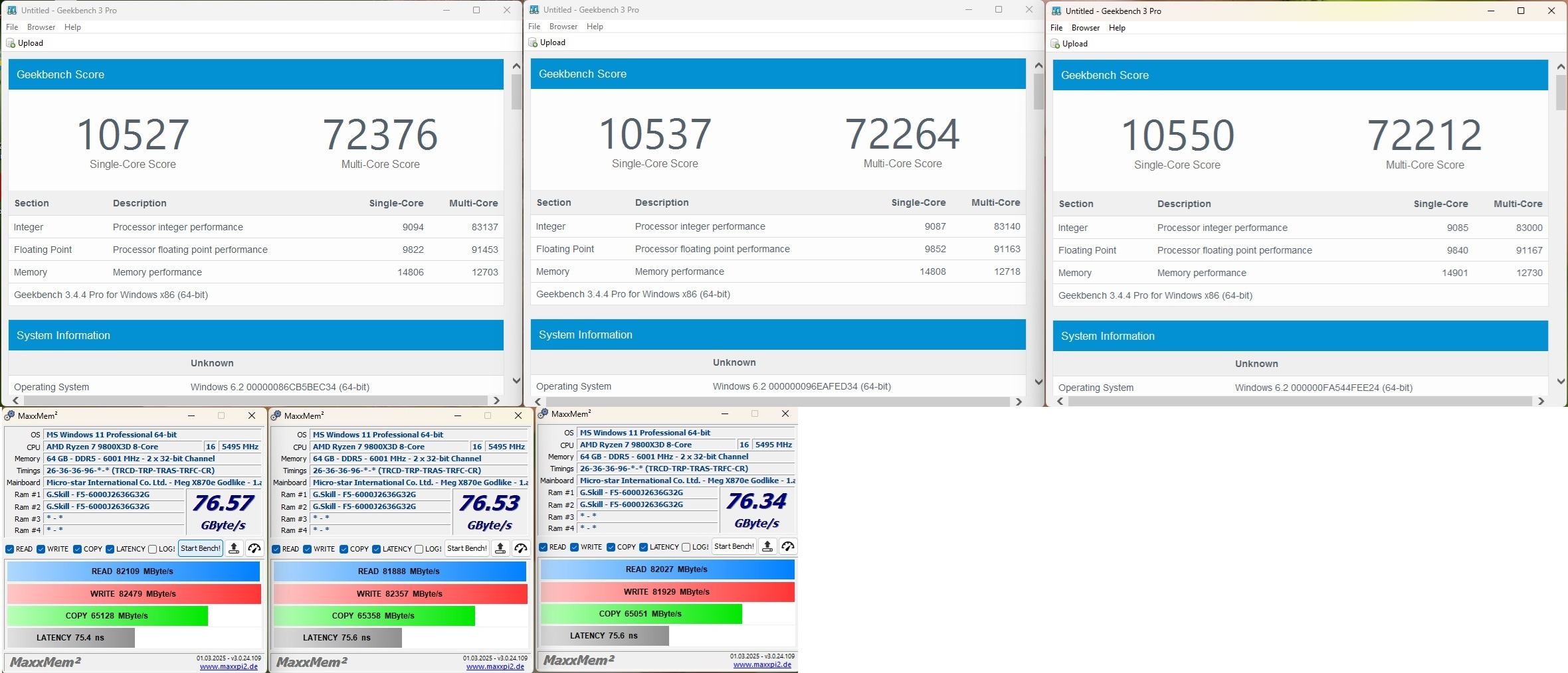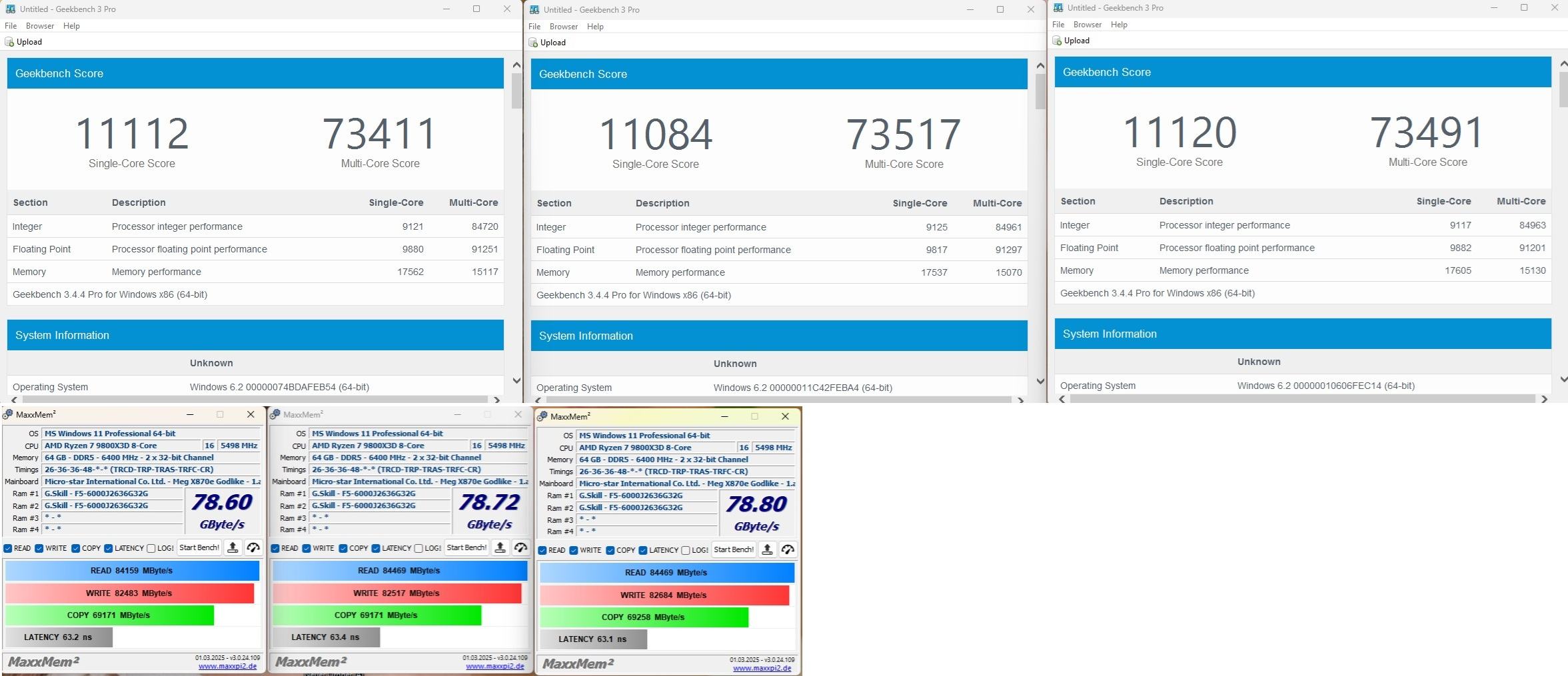 Nun wird es Zeit für synthetische Tests. Ich habe dazu Geekbench3 und Maxxmem2 gewählt. Ich habe alle Tests 3 mal durchgeführt und den Mittelwert berechnet. Zusätzlich habe ich diese Test im Diagnosemodus durchführt, um stärkere Abweichungen durch Nebenlasten zu minimieren. Bei Maxxmem2 zeigt gut die Latenz, Geekbench3 die wirkliche Speicher Performance. Der 9800X3D läuft wie bei allen Tests mit PBO +200Mhz bei CO -30, also mit moderater Spannung.