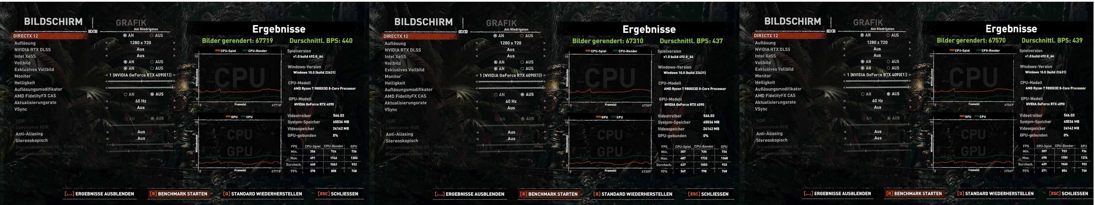 Um den Einfluss des Arbeitsspeichers darzustellen, habe ich für möglichst reproduzierbare Ergebnisse auf In Game Benchmarks zurückgegriffen. Zum Einsatz kamen dabei Shadow of the Tomb Raider, Far Cry Primal und Final Fantasy XIV. Auch diese wurden 3 mal durchgeführt und die Ergebnisse gemittelt, um Schwankungen durch zufällige Nebenlasten zu reduzieren. Sämtliche Tests wurden in der Auflösung 1280x720p mit niedrigen Einstellungen durchgeführt, um eine Limitierung durch die Grafikkarte zu vermeiden und die reine CPU-Leistungssteigerung zu veranschaulichen.