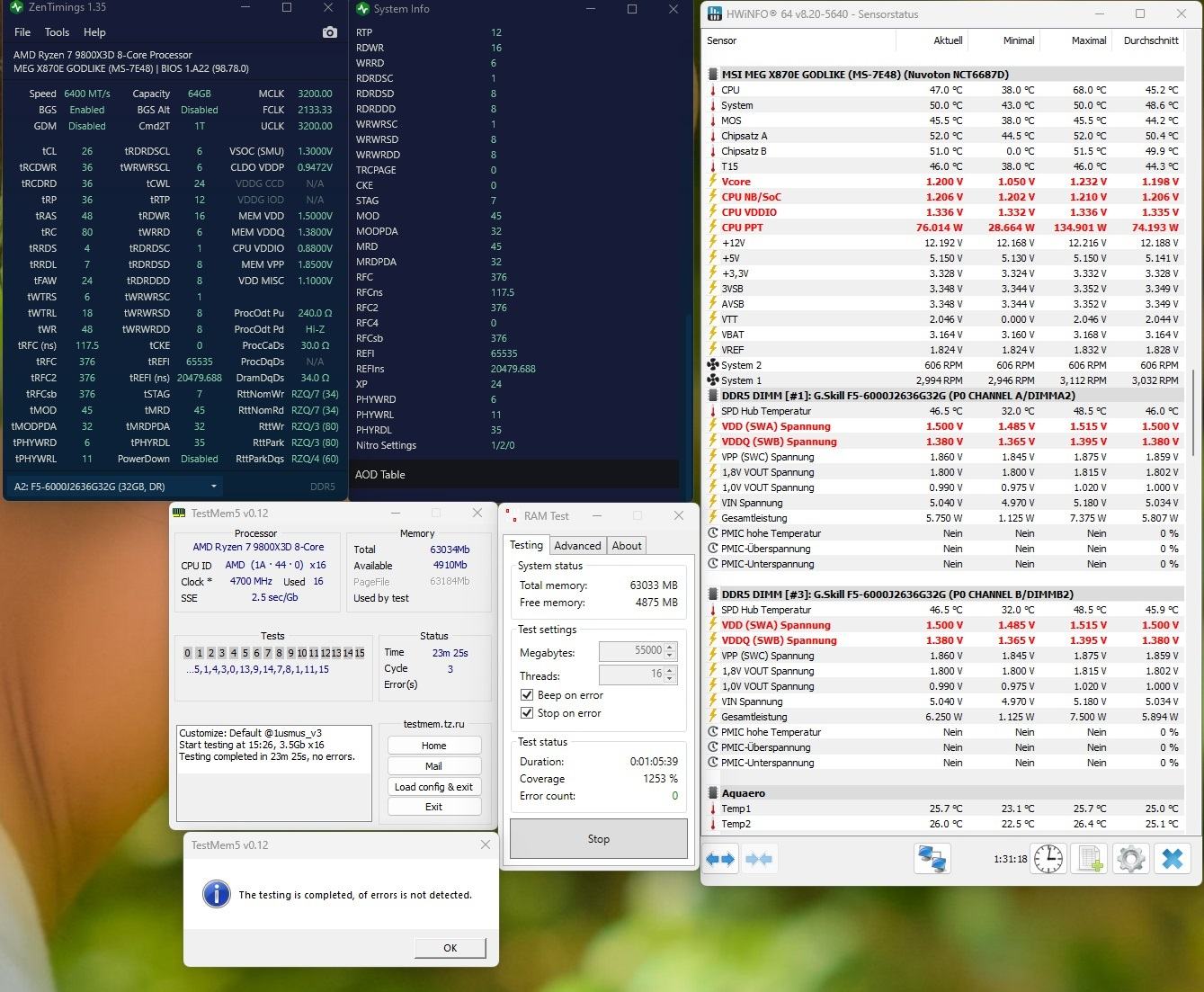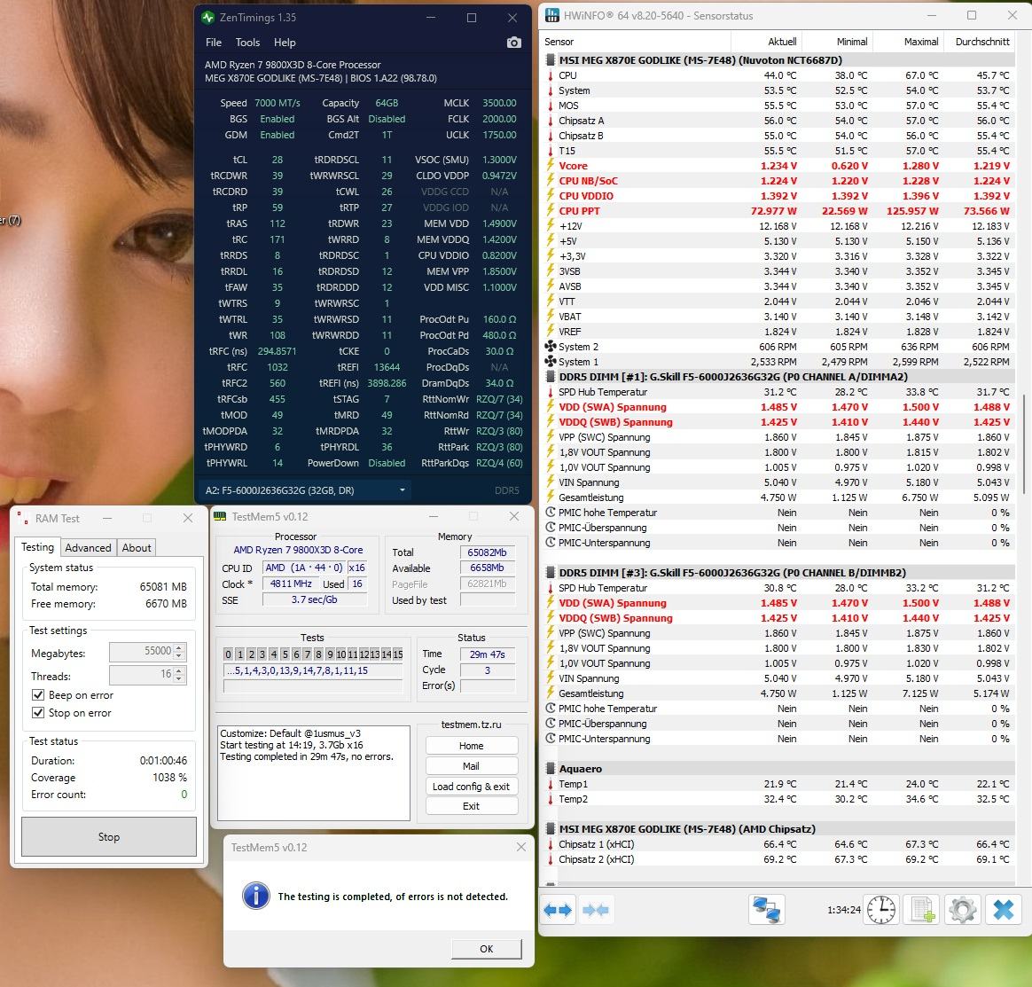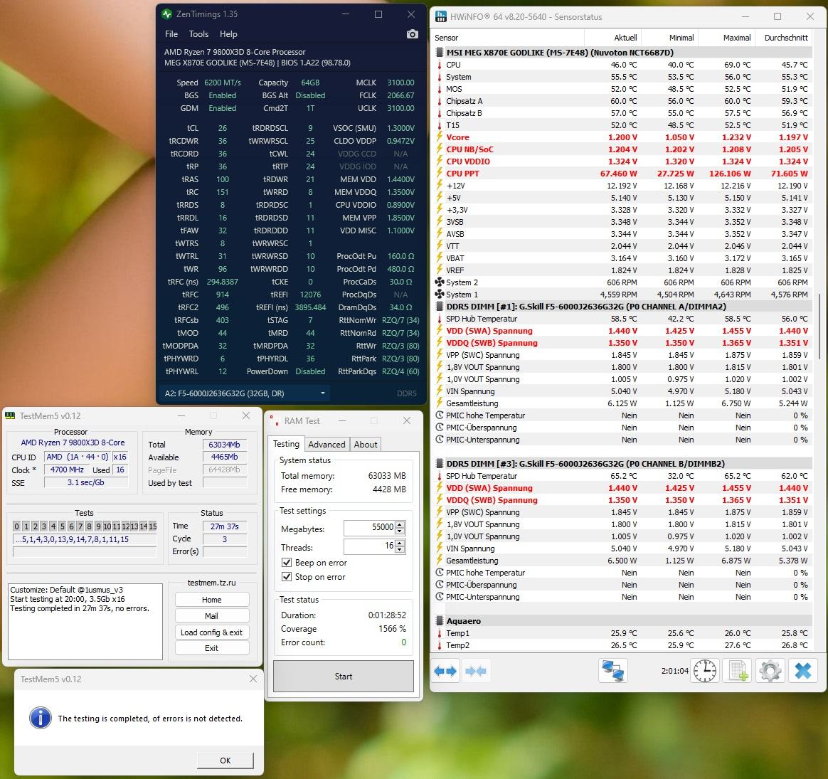 Doppelseitig bestückter Speicher wird wesentlich wärmer als SR-Module, ich würde davon abraten diesen ohne jeglichen Airflow jenseits der 1,43V zu betreiben und dann TM5 Orgien zu veranstalten. Dieser Test erzeugt extrem viel Hitze, mehr als beim Karhu Speichertest. In meinem Fall sorgt das Dashboard des Mainboards für einen Hitzestau bei dem 2. Modul.