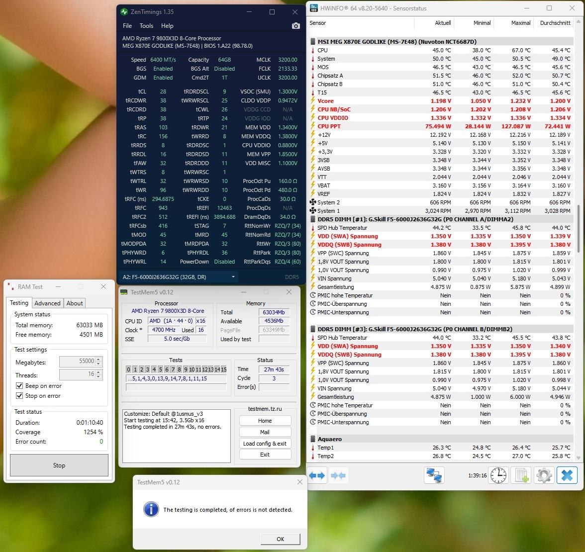 Jeder Test lief 1 Stunde Karhu und ca. 25min TM5 @1usmus, um eine grobe Aussage treffen zu können. Die Spannungen stellen die mindestens benötigte Spannung dar, um diesen Test zu bestehen! Bei 6400CL28 und darunter war es notwendig die VDDQ höher als die VDD zu haben, da diese einfach schon „zu niedrig“ ist. Ich habe zusätzlich die Temperaturen von beiden Modulen mit aufgeführt, denn wie man den Werten entnehmen kann, spielt die Temperatur keine unerhebliche Rolle.
