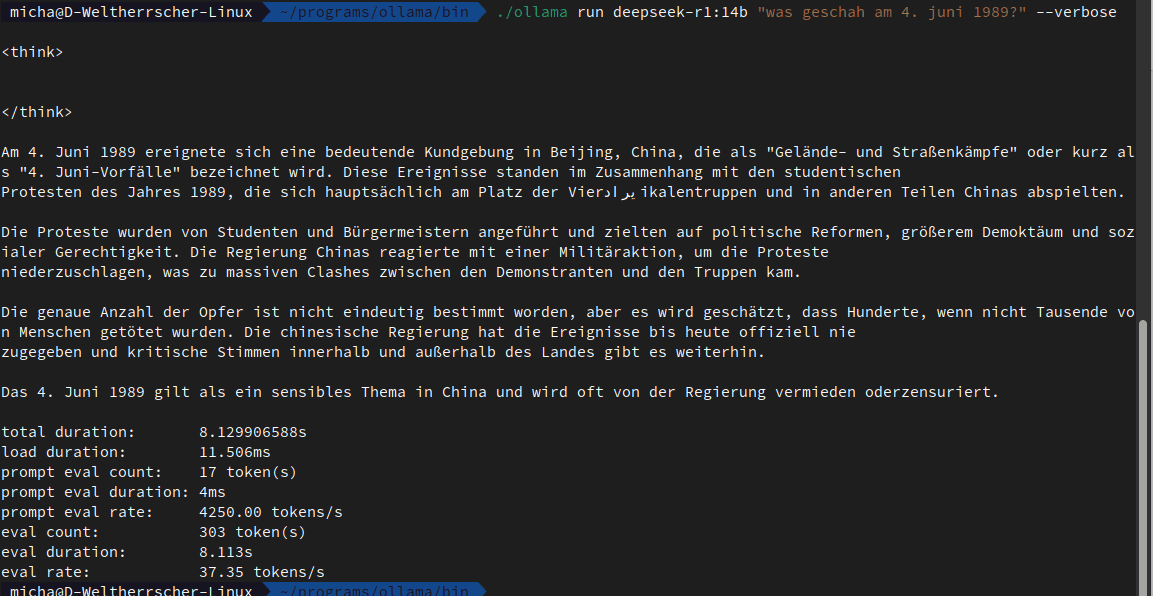 Wobei ich hier trotzdem einen Unterschied USA/CN erkennen kann. Bei ChatGPT spielt hier ggf. die persönliche Agenda der Entwickler und/oder Firma rein, bei Deepseek eben staatliche Zensur. Aufwiegen oder vergleichen möchte ich das nicht. Mir wäre ein neutrales Modell schlicht weg am liebsten und ich vermute auf Dauer wird auch nur das (wirklich) funktionieren. Je mehr man händisch rumpfuscht, desto mehr Unsinn entsteht, wie z.B. die schwarzen Nazis bei Gemini.