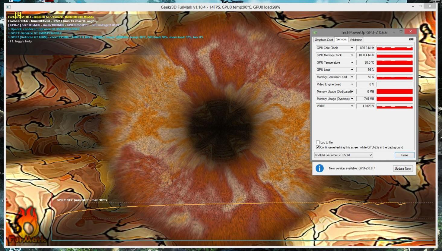 Die GPU 2 (Geforce GT650M) lief demnach bei 835MHz, mem: 2000MHz, GPU load: 99%, mem load: 5%, fan: 0% -> Burn-In Score ist 967 Points, FPS avg. 10, Temp max war 84°C (avg gefühlt bei 79°C).