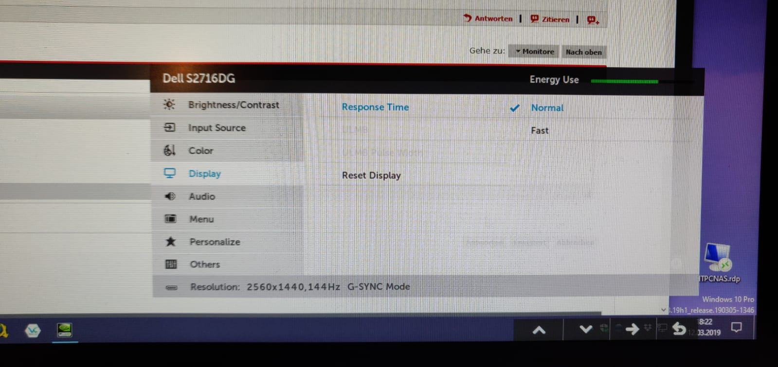 Hab natürlich auch schon paar Dinge ausprobiert die im Internet empfohlen wurden: Farb/contrast/gamma einstellung in nvidia und monitor settings verändert, icc profil geladen, mit gsync rumgespielt, response time auf normal. Leider alles nix geholfen.