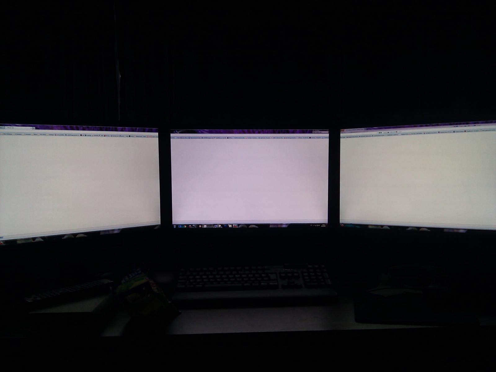 Eines stößt mir allerdings bitter auf. Ein Monitor unterscheidet sich von der Farbgebung recht deutlich von den anderen beiden. Einer hat irgendwie einen leichten Rotstich wogegen die andern beiden eher ins grünliche gehen?! SO sieht es zumindest im Vergleich aus...