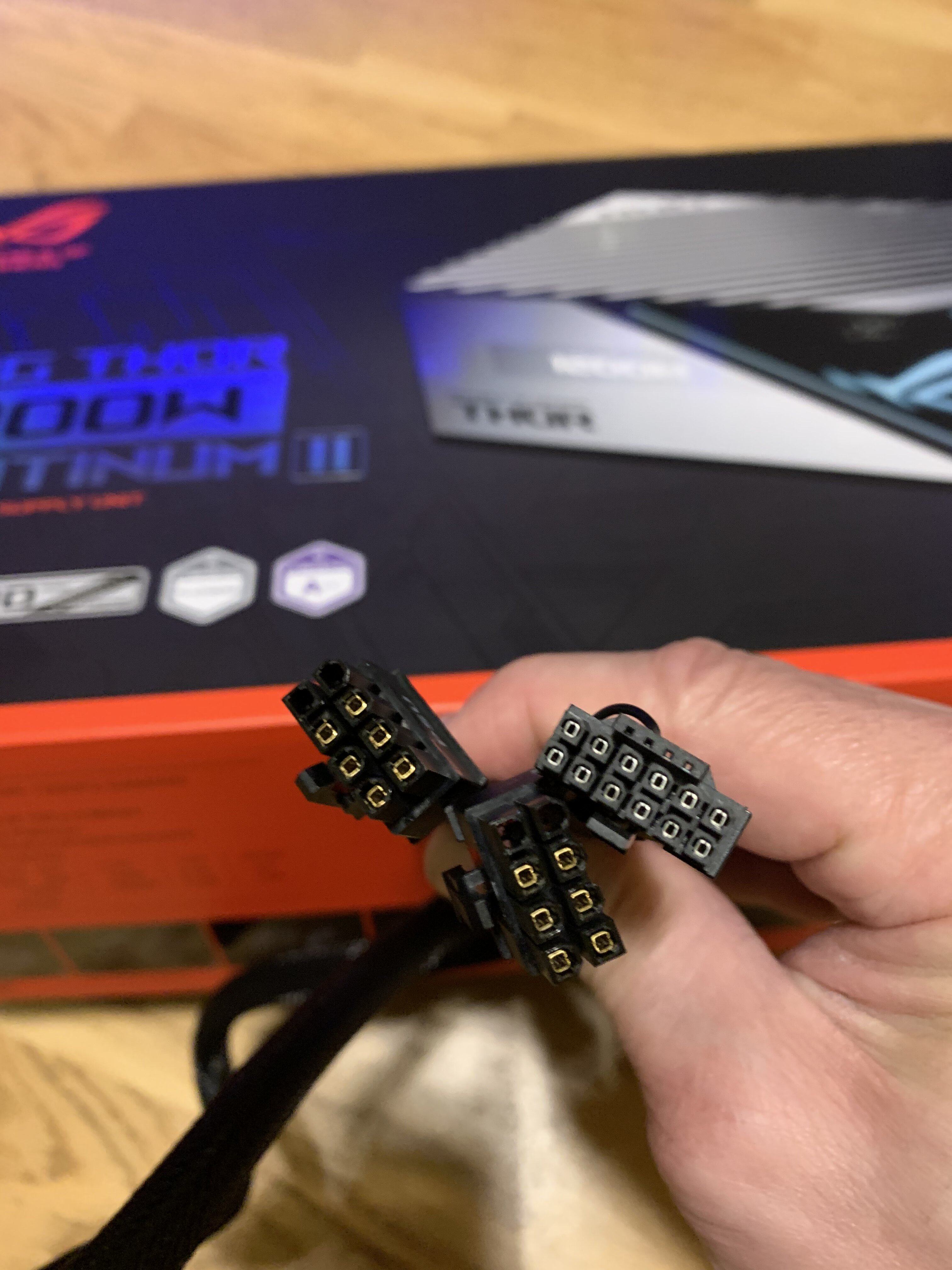 Die Norm sagt das ein PCIe Stecker für 150Watt ausgelegt sein muß, das sind dann halt relative simple Kontakte mit einfachere beschichtung und evtl. auch höhere Toleranzen in der Fertigung (macht die Stecker auch billiger weil z.B: die Spritzguß formen länger verwendet werden können).Ein 12+4 Pin auf 2 x 8 Pin Kabel was angeblich bis 600 Watt ausgelegt ist, laut Asus. Jetzt verwirren mich diese 2x8 Pin aber sehr weil es ja herkömmlich geheißen hat nur 150 Watt gehen durch so einen 8 Pin Stecker.