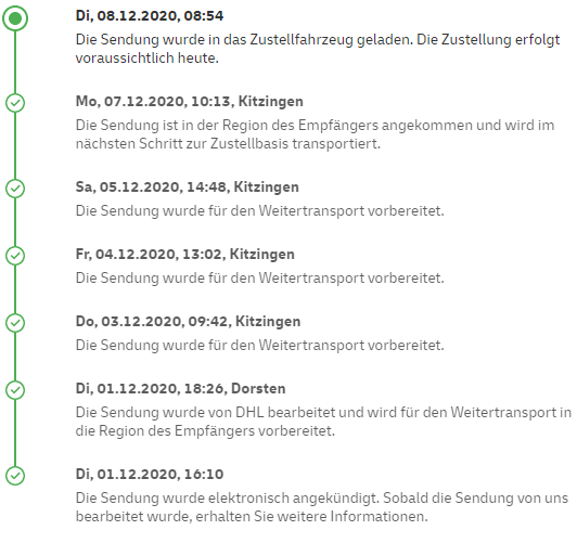 Ich habe zwei Bestellungen. Eine aus Alternate und eine aus Thomann. Beide sollen mit DHL geliefert werden. Die Bestellung von Alternate wurde als erste an DHL übergeben und die von Thomann später. Nun sag mir, wie kann es sein, dass die Bestellung von Thomann schon unterwegs ist (also im Transportwagen), aber die von Alternate wird immer noch und seit gestern Abend für den Weitertransport vorbereitet.