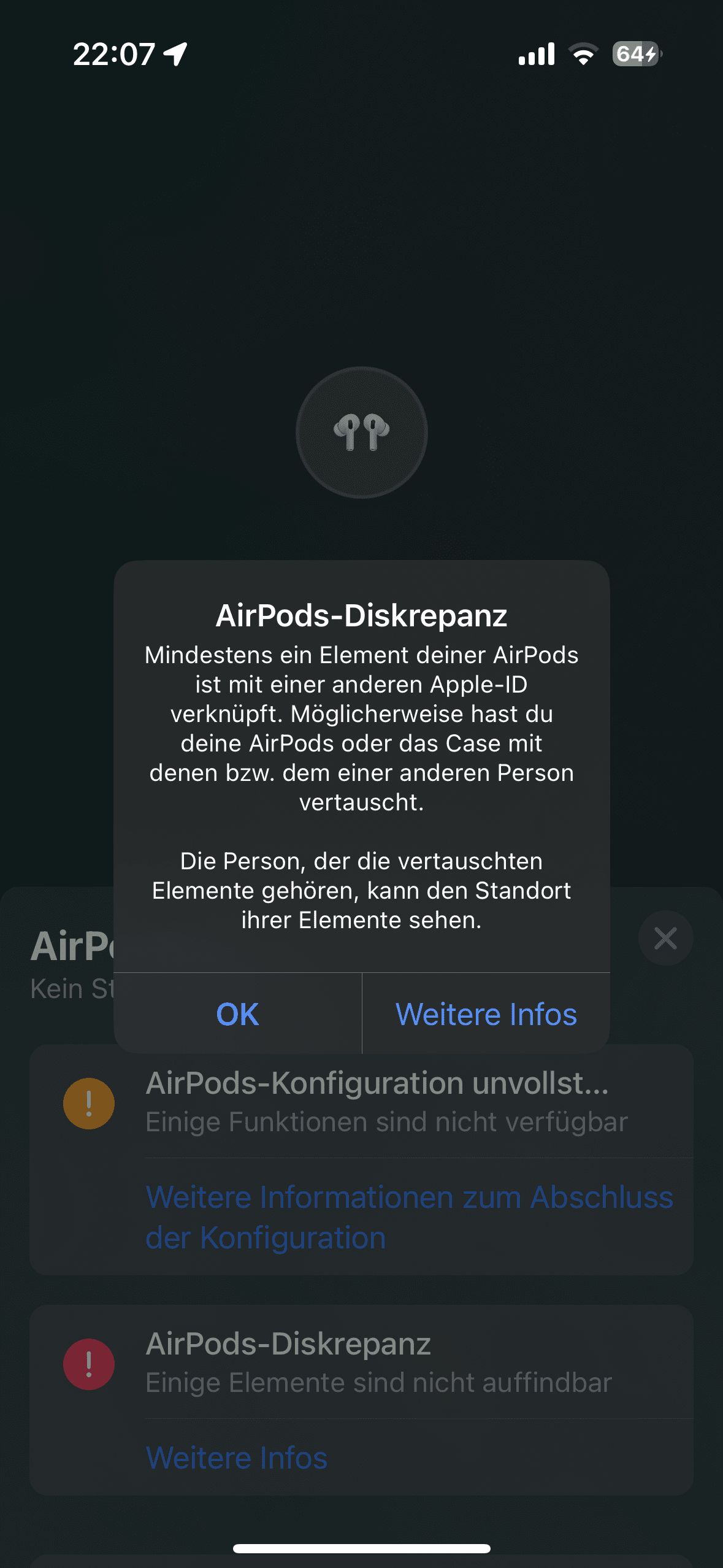 Die "fremden" Pods werden nun mit der Nr. des Eigentümers angezeigt ("AirPods Pro von 0172 12345 - Find My") mit Standort angezeigt. Zuvor gibts ein Popup, in dem die teilweise verschleierte Apple-ID des Eigentümers angezeigt wird. Wie man das ändern kann, k.A., denn unter https://support.apple.com/de-de/apple-id stehen nur Geräte, wie iPhone, iPads etc, aber keine Airpods (k.A. warum). Aber beim Weiterverkauf muss man diese entknüpfen. Weiß jmd wo? Ein Entfernen aus "Wo ist" reicht nicht