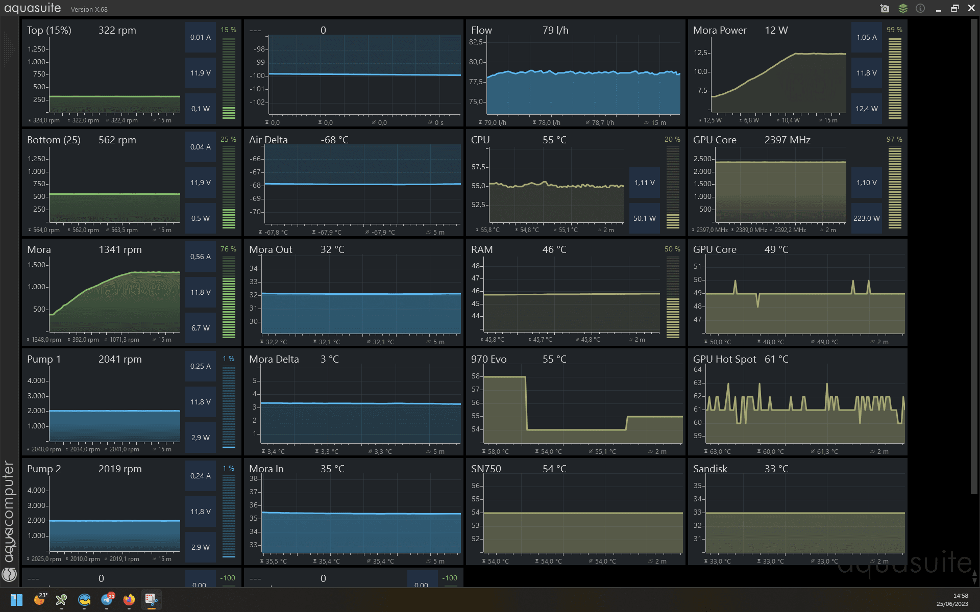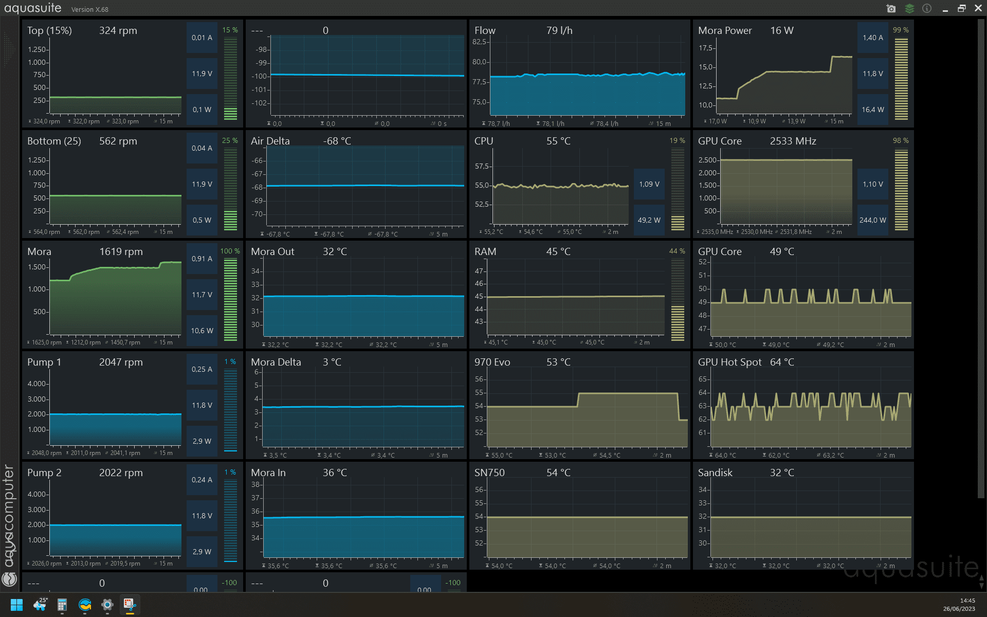 Bzgl. Temp.Sensoren: Ich nutze die von AquaComputer und habe die beide innen an die Slotblende geschraubt und da jeweils die Schlauchfittings dran gemacht. Die kann man u.a. mit dem Quadro oder Octo nutzen.