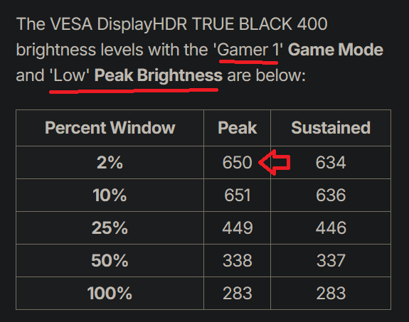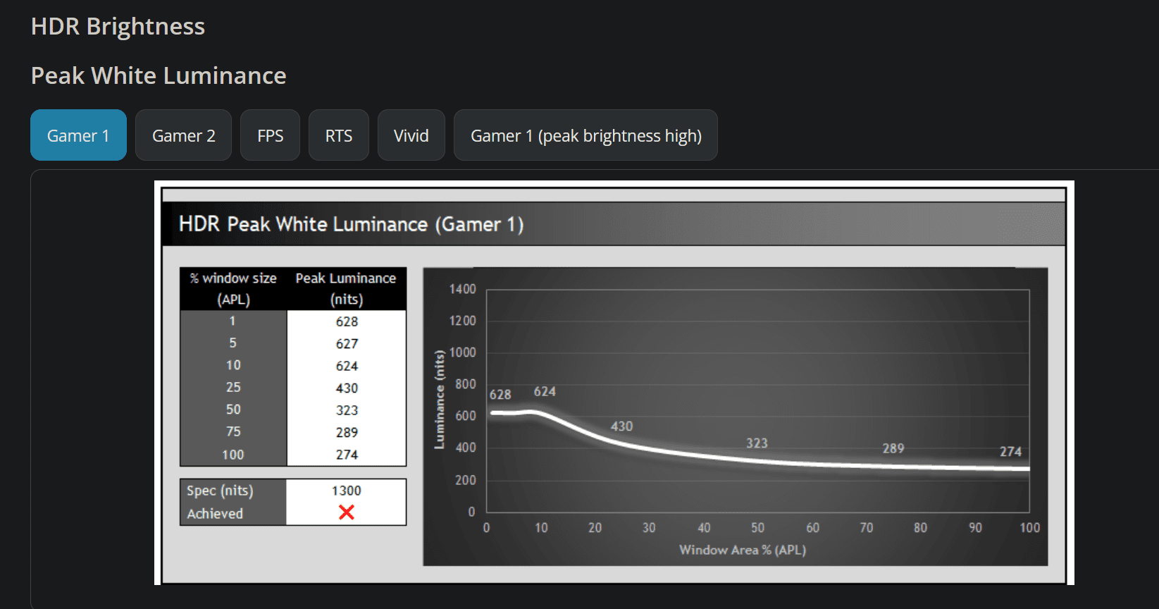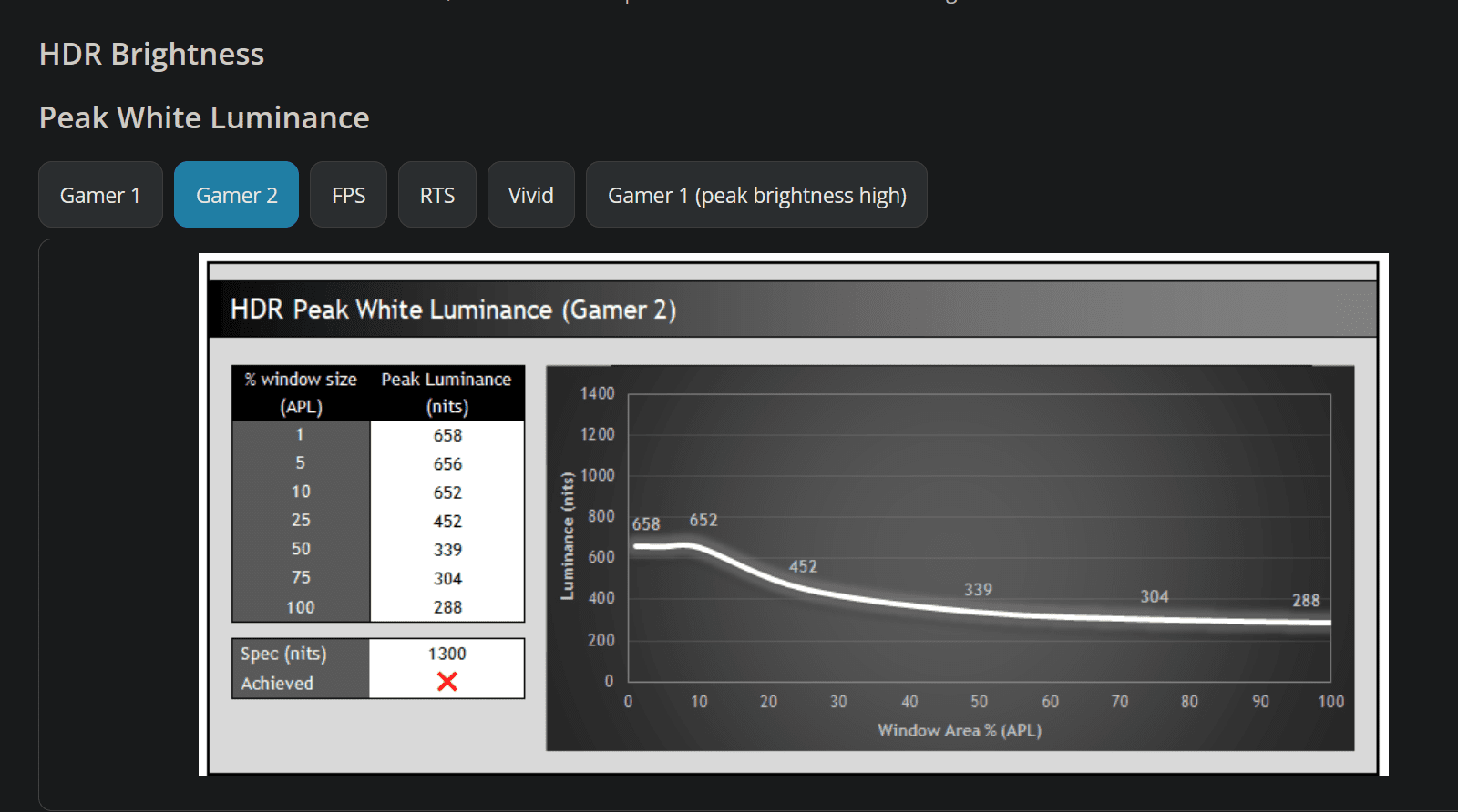 1. die 1.300 Nits bzw in dem Game Mode hier den RTINGS getestet hat die 1.200 Nits erreicht er bei 2 % Window nicht aber bei 10 % Window da er bei 10 % Window ja schon abdunkelt durch das