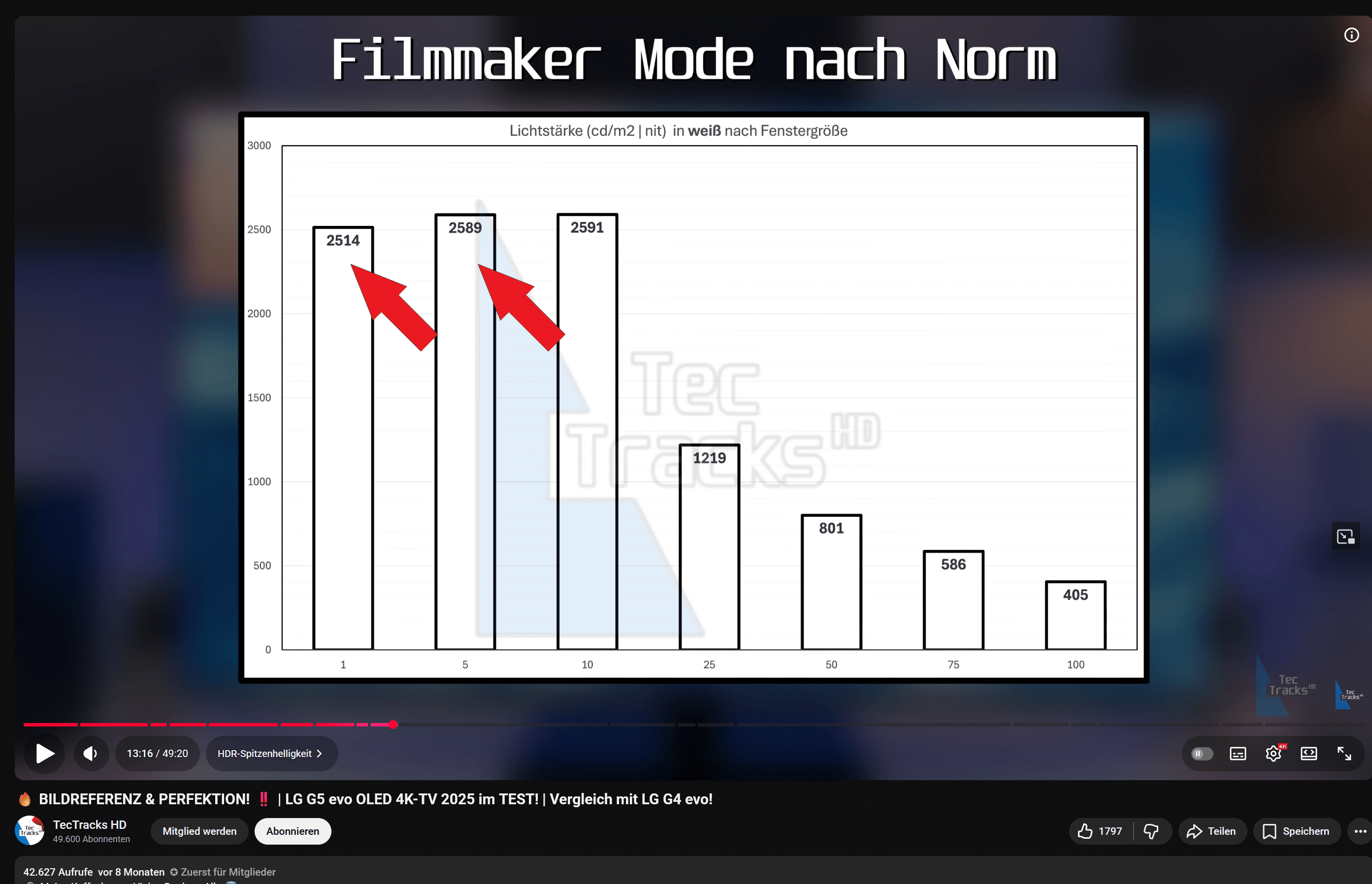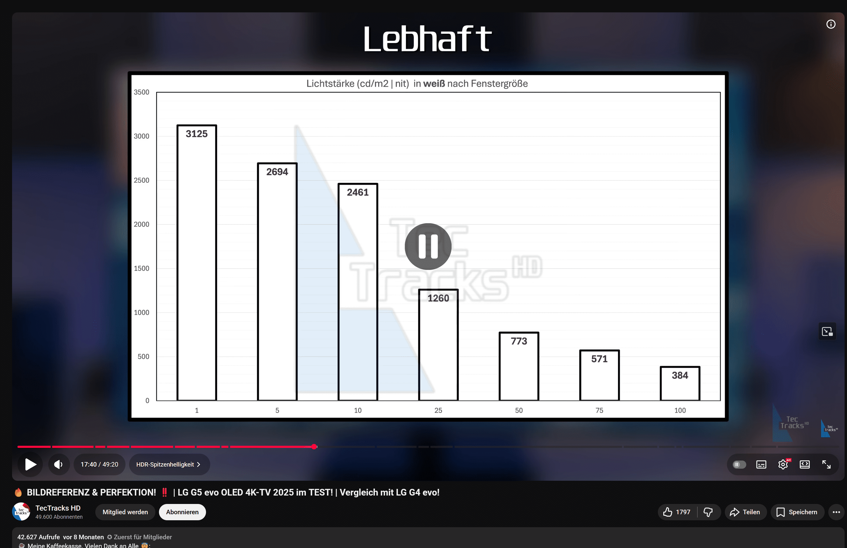 Im Filmmaker Mode kommt ein LG G5 OLED TV auf 2.500 Nits ---------------------------------------------- Im Vivid Mode kommt ein LG G5 OLED TV dagegen aber auf 3.100 Nits