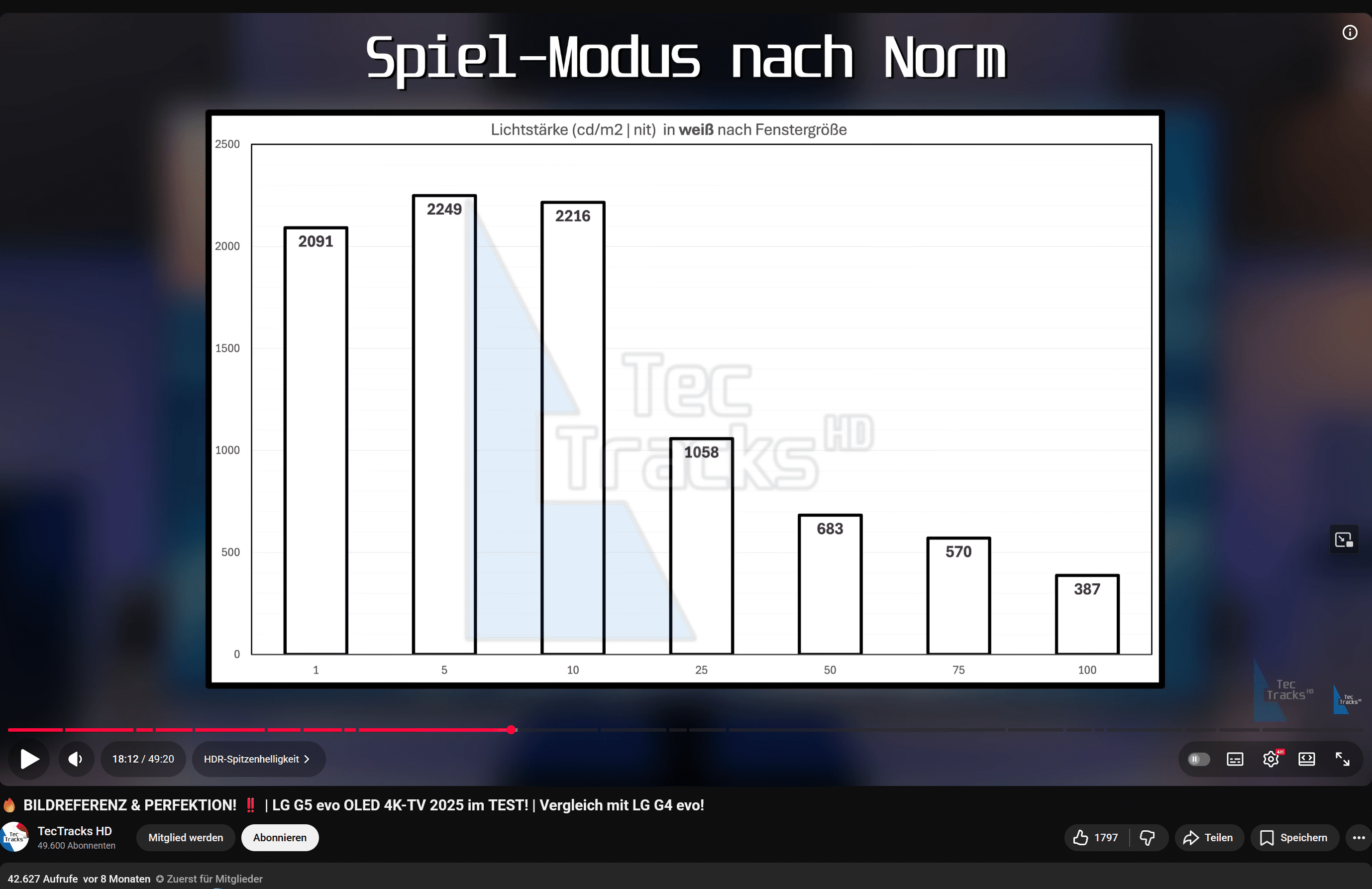 Im Game Mode wiederrum kommt der LG G5 OLED TV aber "nur" noch auf 2.250 Nits :
